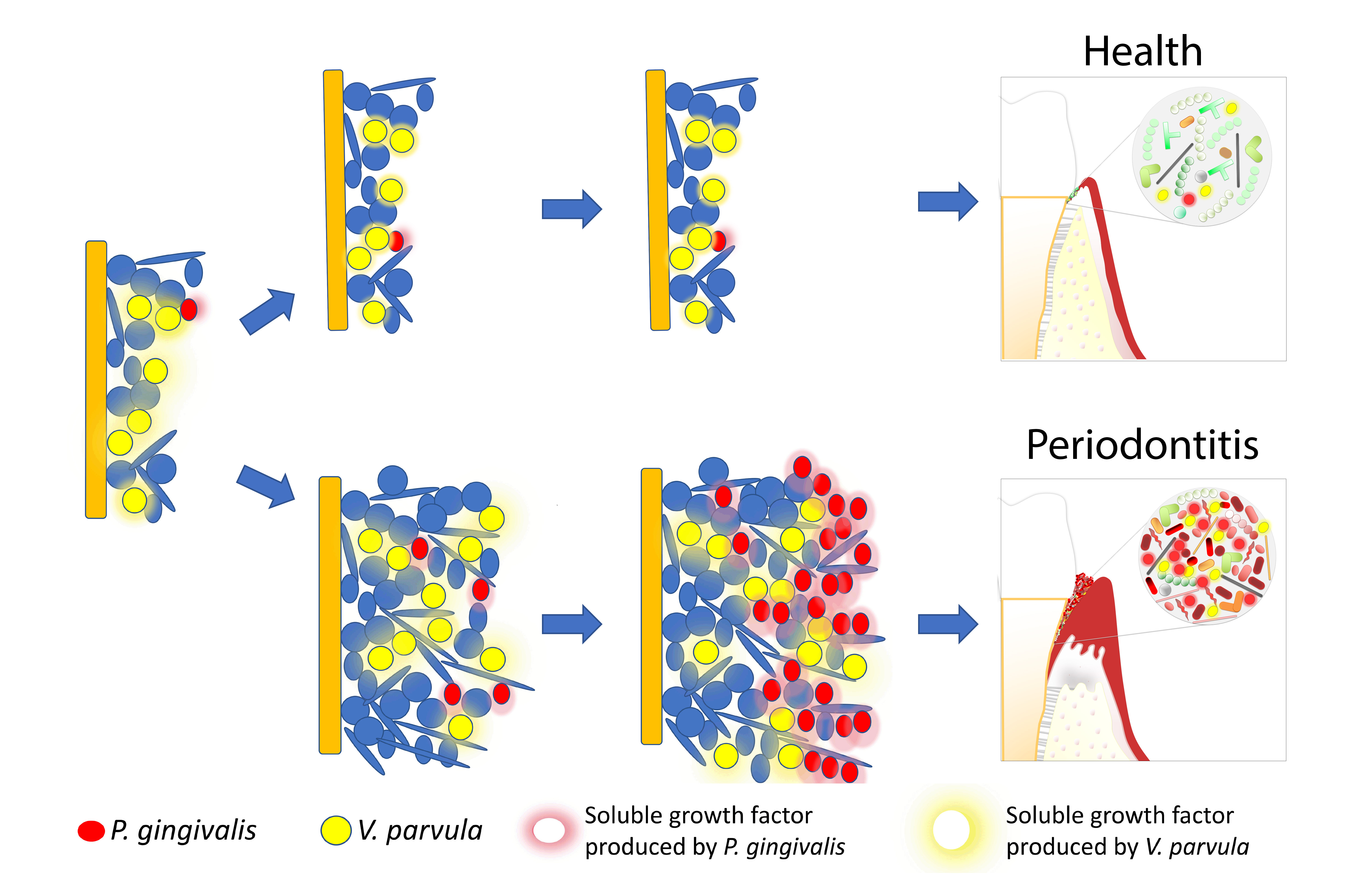 Figure 1. Accumulation of V. parvula in dental communities promotes growth of P. gingivalis. During early stages of biofilm formation on tooth surfaces, P. gingivalis is not able to establish since it cannot grow from a low-cell-density population. V. parvula does not depend on cell-density, so it can grow, producing a low-mass soluble factor that, once it accumulates to a threshold concentration, is capable of supporting growth of P. gingivalis, which in turn contributes to the development of periodontitis (as shown in the bottom arm of the figure). Once P. gingivalis becomes established at high-cell-density, its growth is supported by its own soluble low-mass growth factor. V. parvula, which is also an abundant species in mature plaque, still contributes to stabilize the biomass of P. gingivalis in the dysbiotic periodontitis-associated community. The accumulation of V. parvula and the subsequent growth of P. gingivalis can be prevented by adequate oral hygiene (top arm of the figure).