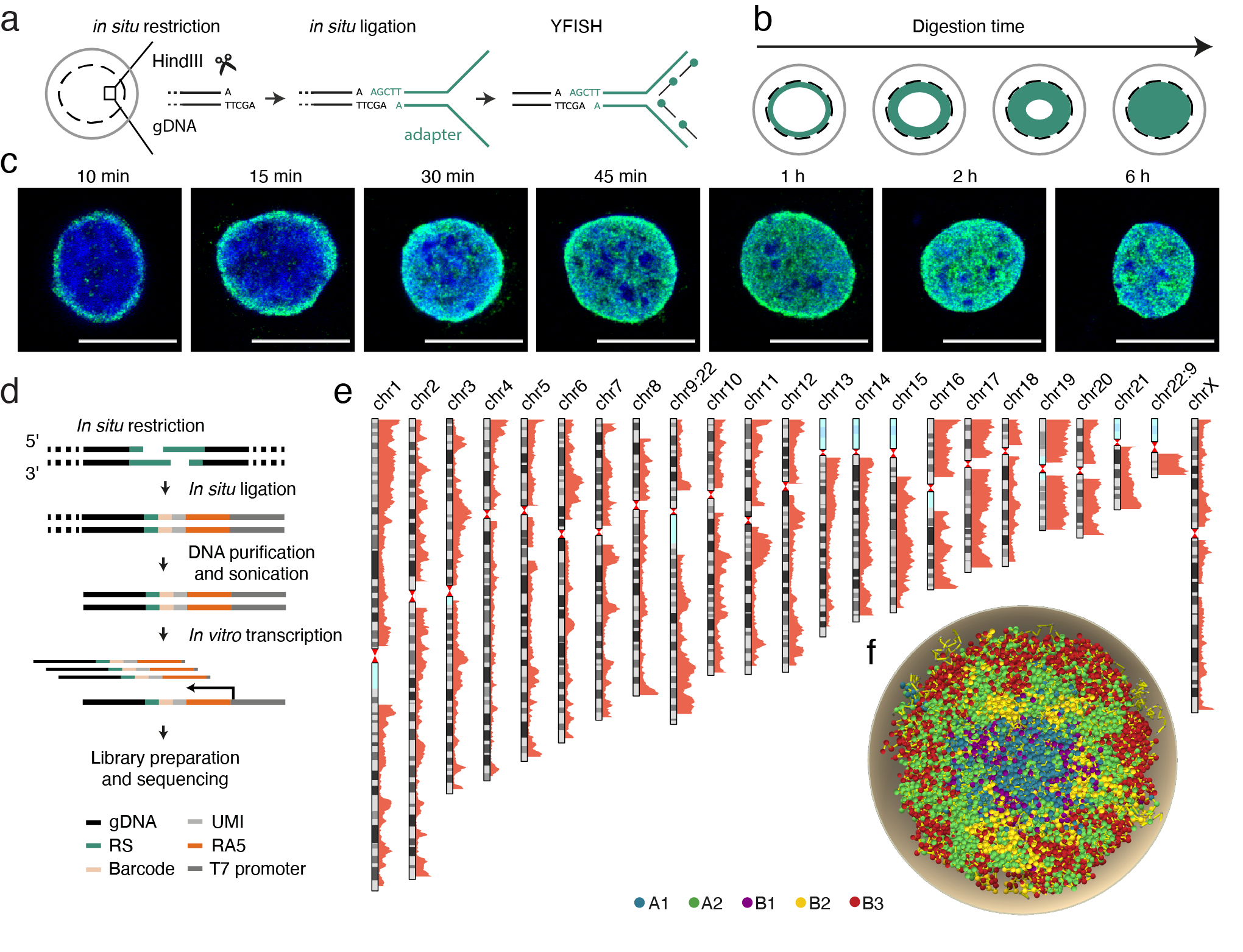 Figure 1. GPSeq exploits in situ restriction enzyme digestion and linker ligation (a) as well as diffusion of the restriction enzyme from the nuclear periphery inwards (b), to generate growing bands of restricted chromatin. (c) STED microscopy confirms the expected concentric band profiles. (d) Sequencing of digested sites from samples incubated with the restriction enzyme for increasing durations reveals the radial localization of individual genomic loci (GPSeq score). (e) GPSeq score profiles along individual chromosomes (1-Mb overlapping windows, 100-kb step size). (f) Example of a whole-genome reconstruction generated by combining GPSeq data with Hi-C data. Each bead corresponds to a 100-kb genomic window. A and B subcompartments are shown in different colors.