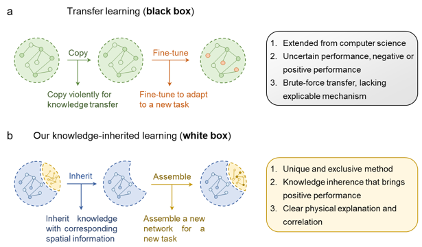 Transfer learning is a mature algorithm extended from computer science. The basic operation process is to transfer the pre-trained neural network in the source task to assist the training of target task. However, the performance of transfer learning cannot be guaranteed. Sometimes, the performance even becomes worse compared with that without transfer learning. In other word, transfer learning is like a ‘black box’ without revealing its internal mechanism, which heavily relies on the brute-force attack of features and lacks reasonable explanation (Fig. 2a).