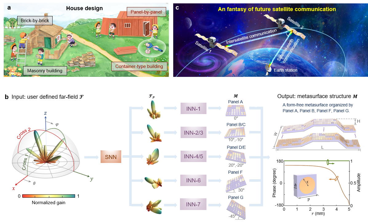 Figure 1. Schematic of the knowledge-inherited neural network. a, Knowledge-inherited paradigm for a metasurface inverse design. Similar to “brick-by-brick” masonry buildings, conventional neural networks are inseparable, fossilized, and single-functional once built up. In contrast, the proposed knowledge-inherited (“panel-by-panel”) neural network is oriented for multi-object and shape-unbound metasurfaces. b, Flowchart of the knowledge-inherited paradigm. To match the inheritance-to-assembly scheme, two networks (INN and SNN) are established, where the INN is responsible for the inverse design of each “panel” metasurface, and the SNN aims to explore the relationship between the global target EM response and the local EM response provided by each metasurface panel. For a given “offspring” metasurface, the holistic neural network can be synthesized by assembling the INN and dynamically adjusting the SNN. c, Schematic of satellite communication based on intelligent origami metasurfaces. As a flexible, ultrathin and low-cost competitor for free beam forming, the origami metasurfaces can be conformed on the wings of satellites, which can be freely folded and stretched. Two satellites and one earth station are depicted to illustrate intersatellite communication (case 1) and satellite-earth communication (case 2).
