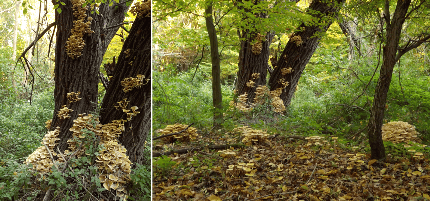 Clusters of fruiting bodies emerge on and around trees in Armillaria-infected areas in the fall. Photo courtesy of Virág Tomity.