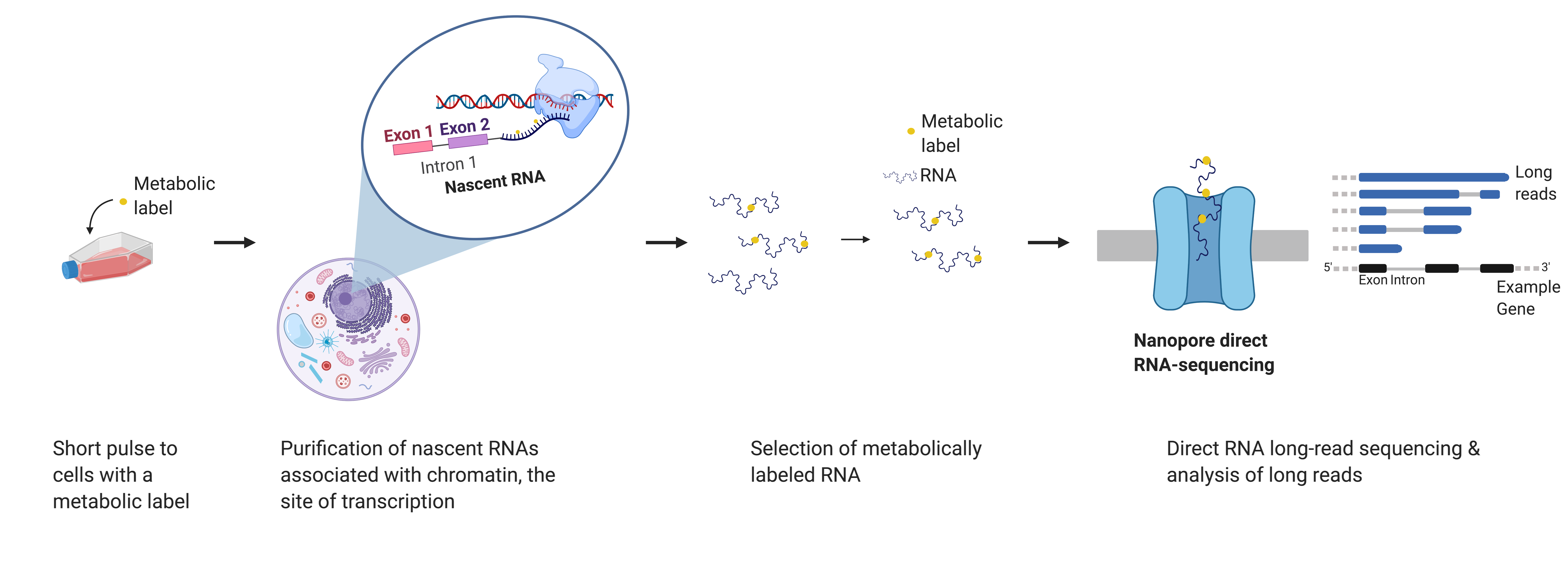 Figure 1: The two cornerstones of nano-COP: 1) enrichment for nascent RNA and 2) long-read sequencing. Created with BioRender.