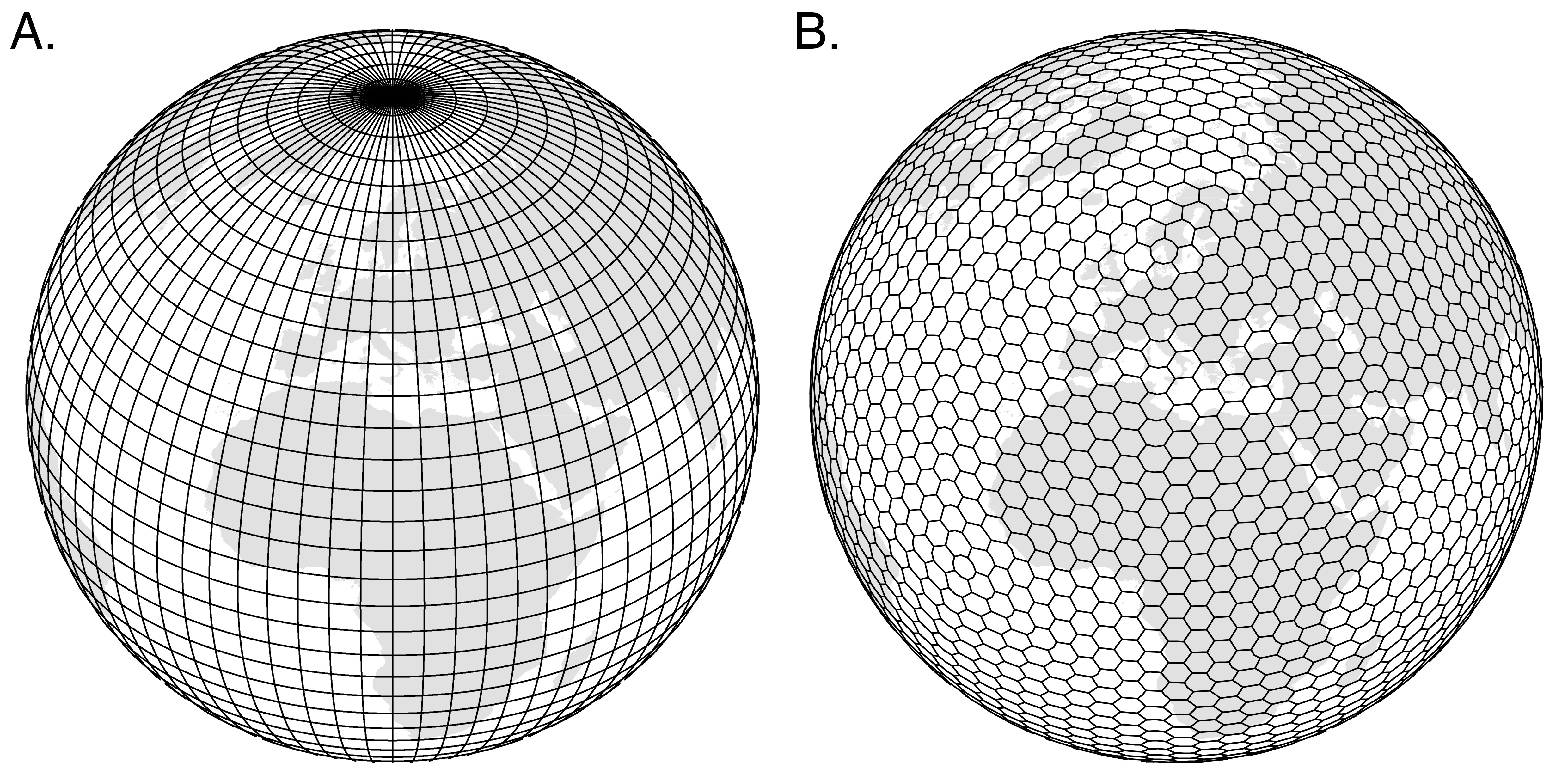The problem with this approach becomes apparent when the grid is transferred from a flat, on-screen projection to the Earth's spherical surface (panel A in the figure above). North-south lines of longitude converge at the Earth's poles, and 30 seconds of arc, for example, traces a much shorter east-west distance at the Arctic Circle than it does at the Equator. Thus the cells of latitude/longitude grids aren't equal-area, or even consistently square. The ISEA3H DGGS (panel B in the figure above) avoids such singularities at the poles, and maintains equal cell area globally.