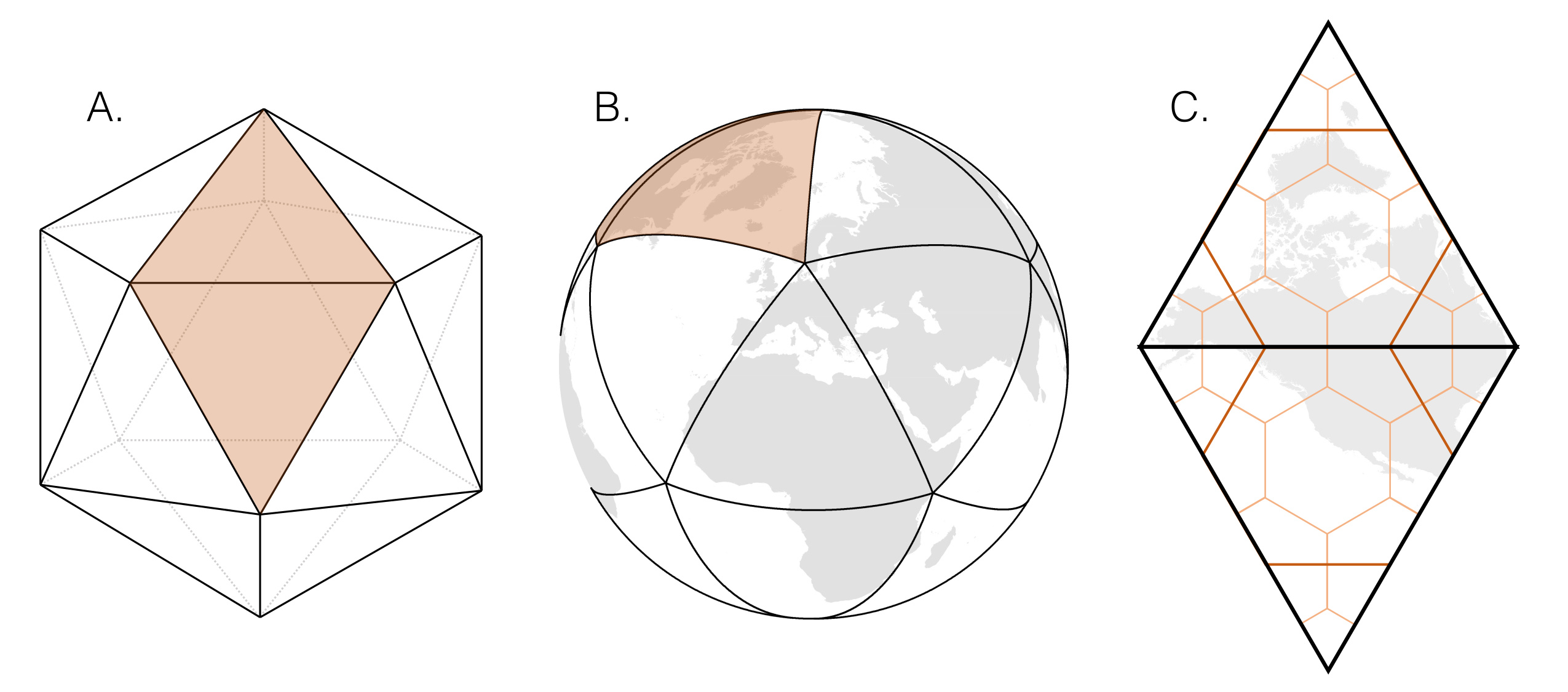 The DGGS is defined by first inscribing a polyhedron - in this case, an icosahedron - within a sphere representing the Earth. The icosahedron is oriented such that it's symmetrical about the Equator, and a minimum number of corner points fall on the Earth's terrestrial surface. The triangular faces of the icosahedron are then divided into equal-area hexagonal cells. At each finer resolution, cells have one-third the area of cells at the previous resolution (that is, there's a ratio or aperture of 3:1 between resolutions). Finally, these cells are (inversely) projected to the circumscribed sphere via the ISEA equal-area projection, developed by Snyder.