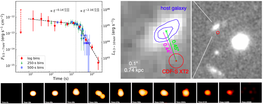 Figure 2: Some key properties of XT2, including X-ray light curve (Top left), X-ray images at different time frames (Bottom), and offset to the host-galaxy center (Top right).
