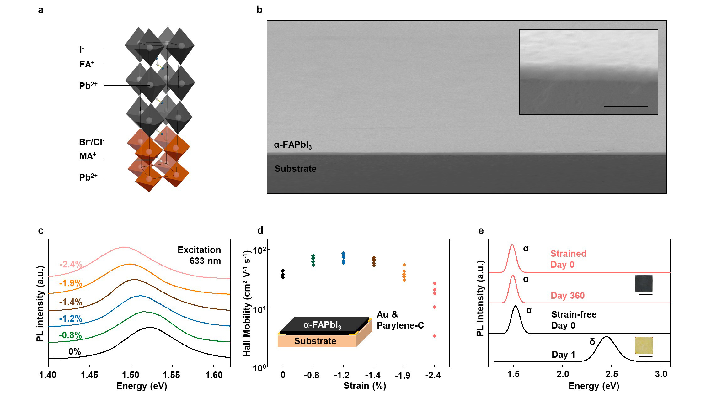 Figure. Work summary. a, Schematic structure of the epitaxial α-FAPbI3 on mixed methylammonium lead chloride/bromide single-crystal substrates. b, Scanning electron microscopy images of the epitaxial α-FAPbI3. Scale bar, 2 µm. Inset, a magnified image showing a clear interface. Scale bar, 200 nm. c, Photoluminescence spectra of the α-FAPbI3 with different strains. d, Hole mobilities by Hall effect measurements showing a peak hole mobility at -1.2% strain. Inset, schematic device setup for hole mobility measurement. e, Phase stability revealed by photoluminescence spectroscopy. A thin, strained epitaxial α-FAPbI3 shows a phase stability up to 360 days while a thick, strain-free epitaxial α-FAPbI3 phase changes to yellow δ-FAPbI3 within 1 day. Inset, optical images of the two samples, showing a clear difference of the phase stability. Scale bars, 2 mm.