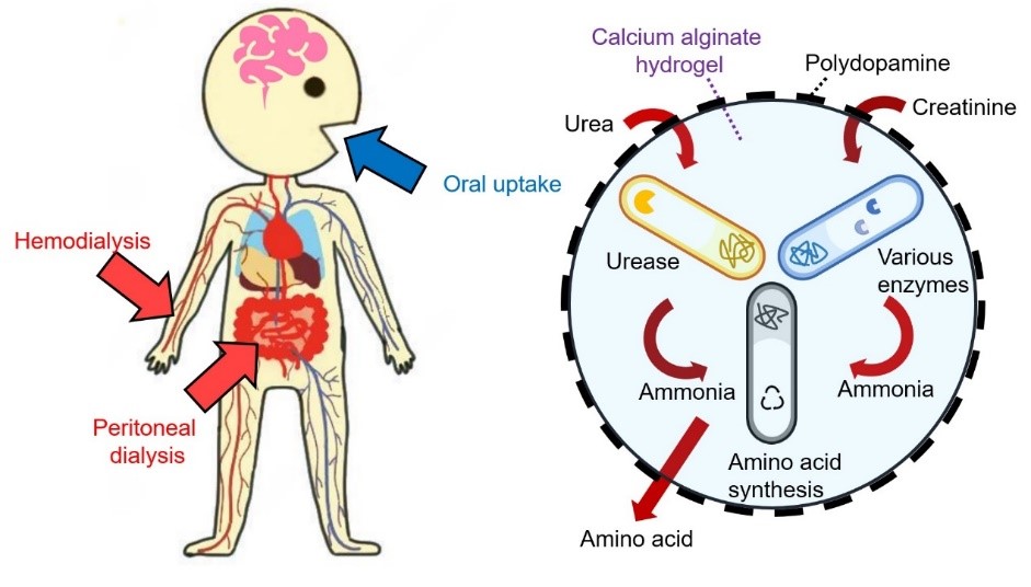 In our most recent study in Nature Biomedical Engineering, we develop an orally delivered bacterial cocktail that can metabolize blood nitrogenous wastes before they diffuse through the intestinal mucosal barrier. First, three strains of bacteria in combination are isolated from faecal microbiota, which can metabolize urea and creatinine into amino acids to degrade nitrogenous wastes. Then, we encapsulated these bacteria in a hydrogel microsphere through microfluidic technology and in situ polymerization. This design controls the colocalization of bacteria and selectively regulates the substance exchange. Importantly, we demonstrated non-invasive treatment in clearing nitrogenous wastes in murine AKI, murine CKF, and porcine kidney failure models. Unlike peritoneal dialysis, which often causes severe peritonitis, we did not find any obvious adverse effects in the entire pre-clinical study.