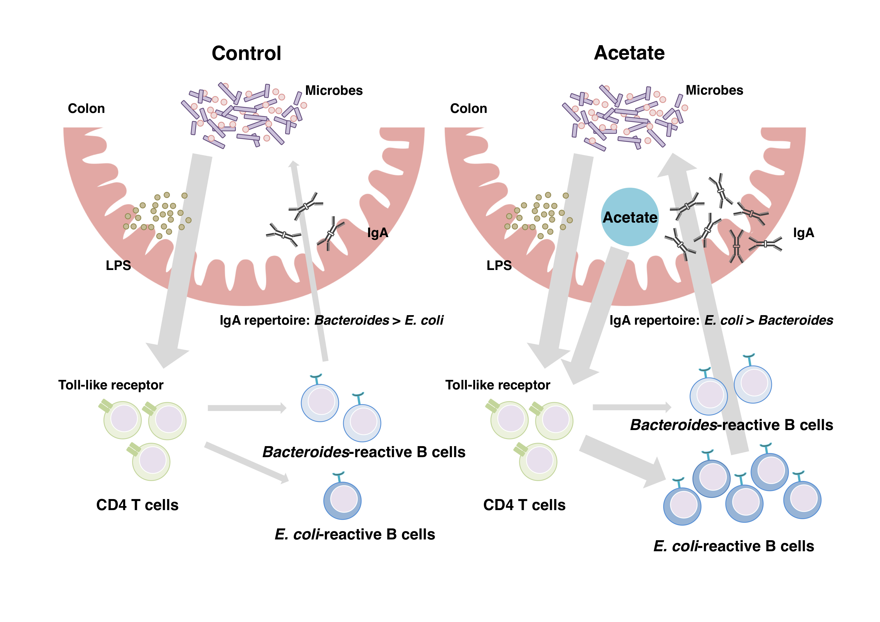 In the current study2, we have focused on the roles of an SCFA, namely acetate, on immunoglobulin A (IgA). Our intestine is equipped to regulate the gut microbiota and suppress excessive immune reactions against them, and IgA is one of the major components of this host intestinal immune system to control these bacteria. Secretory IgA (SIgA) binds to these microorganisms in the intestine and thereby regulates their colonization, proliferation, and potential pathogenicity. However, the composition of gut microbiota can be dynamically altered in response to external stimuli, e.g., diet. In addition, it has been reported that IgA reactivity to the same microorganisms can be differentially regulated in different environments such as inflammatory bowel disease and malnutrition3,4. These findings imply that our IgA repertoire reactive to the gut microbiota can also be altered in response to the gut environment; however, the regulatory mechanism behind this IgA-microbe interaction has not been elucidated.