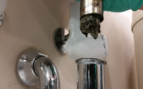 In total, we collected 192 P-trap water samples, 56 P-trap biofilm samples, 128 tap water samples, and 24 each of sink surface, drain cover, and tail pipe samples. From the P-trap water samples, we could infer a few things based on the sample appearance alone: clear and soapy – someone just washed their hands; small hairs floating in the water – someone just shaved; repeated samples that were yellow in color – is urine being dumped down the sink? We asked, it wasn’t. The culture-based methods that we used to quantify target organisms of interest (Pseudomonas aeruginosa, carbapenem-resistant Enterobacteriaceae, and opportunistic plumbing pathogens capable of growth on a cefotaxime containing medium) yielded more informative results. We found that the sink surface, including the faucet handles, were regularly very clean (cleaner than the average household sink), thanks to environmental services diligent daily cleaning of the sinks. The drain cover is the point at which the concentration of target organisms sharply increased from almost undetectable above the drain cover to ≥106 CFU/cm2 in some samples below the drain cover. This high concentration of potentially pathogenic and/or antibiotic resistant microorganisms in proximity to patients and healthcare personnel reinforces the risk that sinks pose as reservoirs for healthcare-associated pathogens.