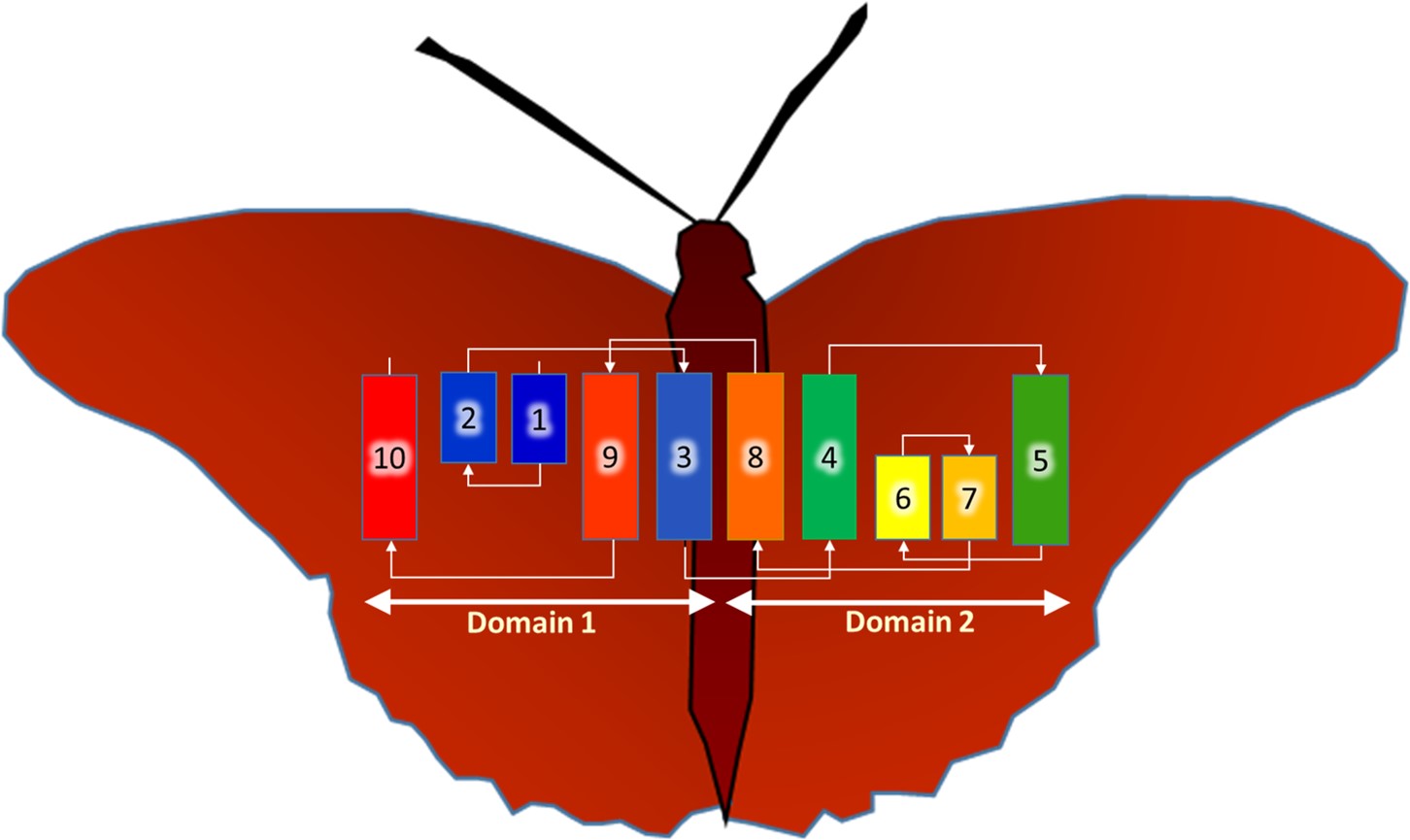 BacA, a jumble of helices -- some long, some short. They twist and turn across the membrane in the order indicated. The final folded form, the functional enzyme, is proposed to emerge when the two, symmetry related domains come together -- the butterfly closes its wings.