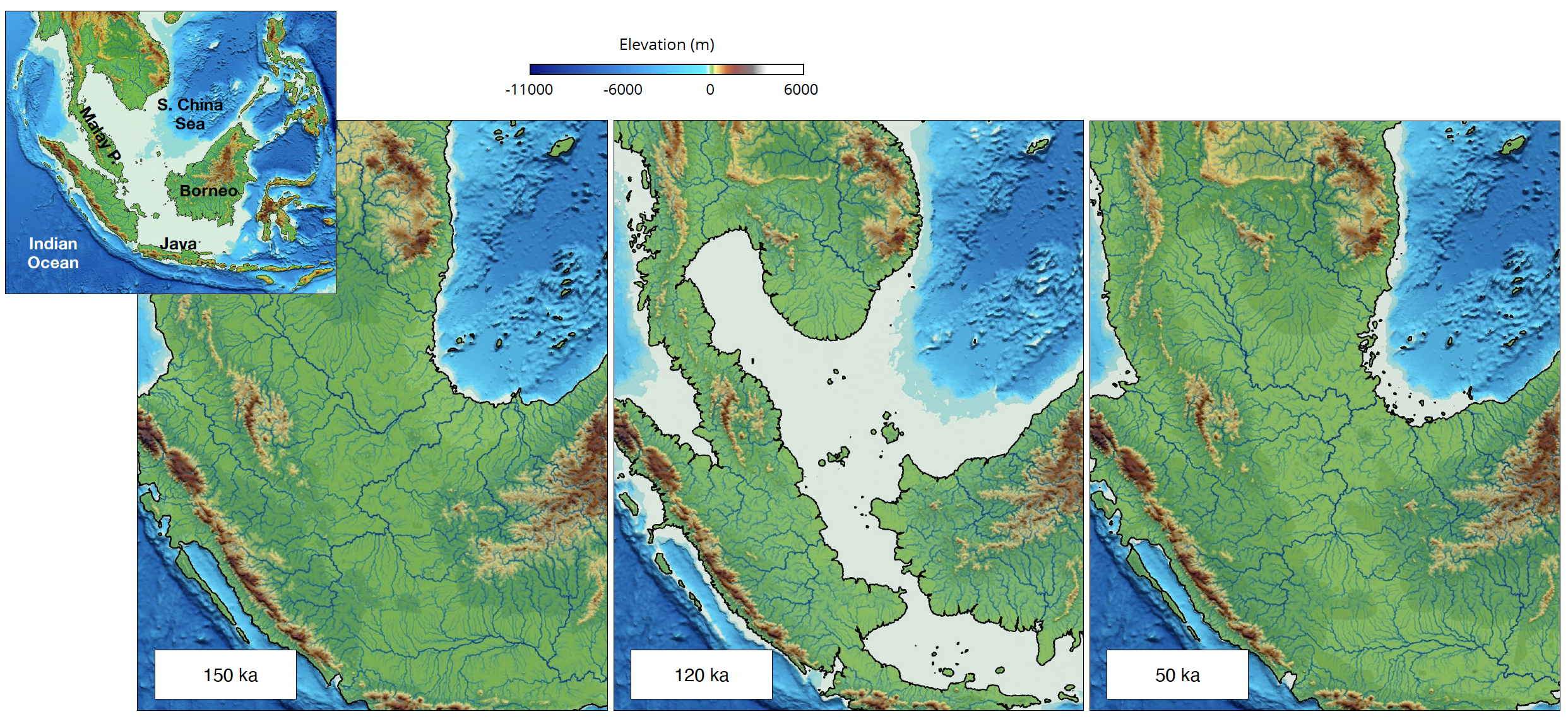 Southeast Asia exhibits some of the most extraordinary species diversity of the planet and contains four of the richest biodiversity hotspots identified by the United Nations Environment Programme World Conservation Monitoring Centre (UNEP-WCMC). Here, we focus on the Quaternary evolution of Sundaland, the partially inundated shelf separating Java, Sumatra and Borneo from the Malay Peninsula. In this study, we investigate the role that physiographic and climatic changes might have played in regional biological diversification. Today, Sundaland is in a refugial-phase, as land above sea level occupies less than 50% of its expanse during most of the Quaternary (Figure 1).