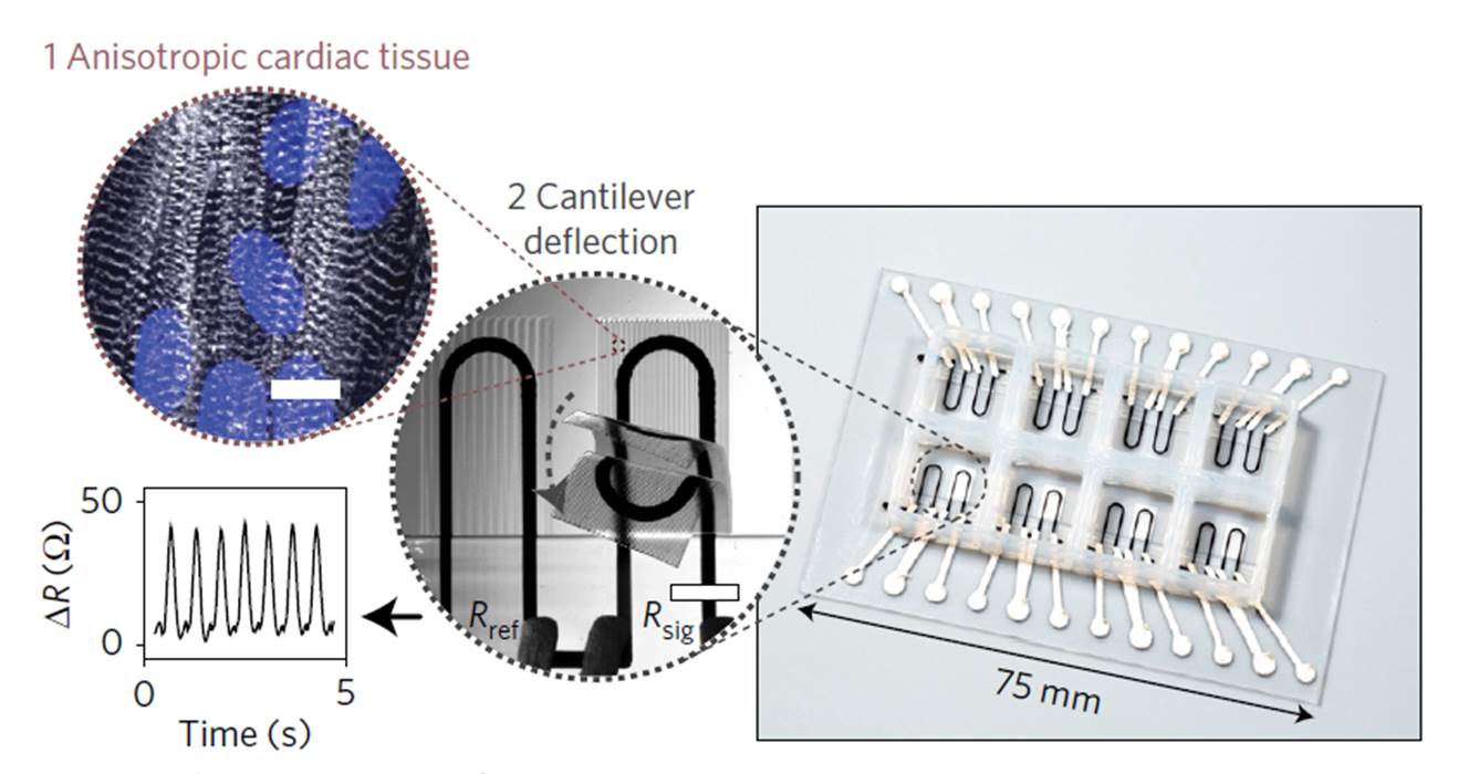 In their article, published in Nature Materials last October, the researchers used sequential deposition of six functional inks to create a new culture system for cardiomyocytes. The different inks used in the printing of the device, selected for their biocompatibility, piezo-resistance and high conductance, enabled the integration of sensors to measure electrical changes in resistance. Each 3D-printed culture chip is composed of eight independent wells organized in a cantilever structure that allows for deflection of the culture during tissue contractions (Figure 1). The strain and electrical sensors embedded in the device are intended to measure changes in stress and electrical resistance during physiological contraction of the cardiac microtissues after, for example, addition of a drug.