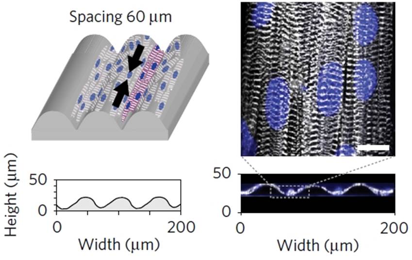 Figure 2. Myocytes self-organize when cultured in 60 μm-spaced grooves. Reproduced from Figure 2, panels b, c, e and f; Lind, J. U. et al. Nat. Mater. doi:10.1038/nmat4782 (2016).