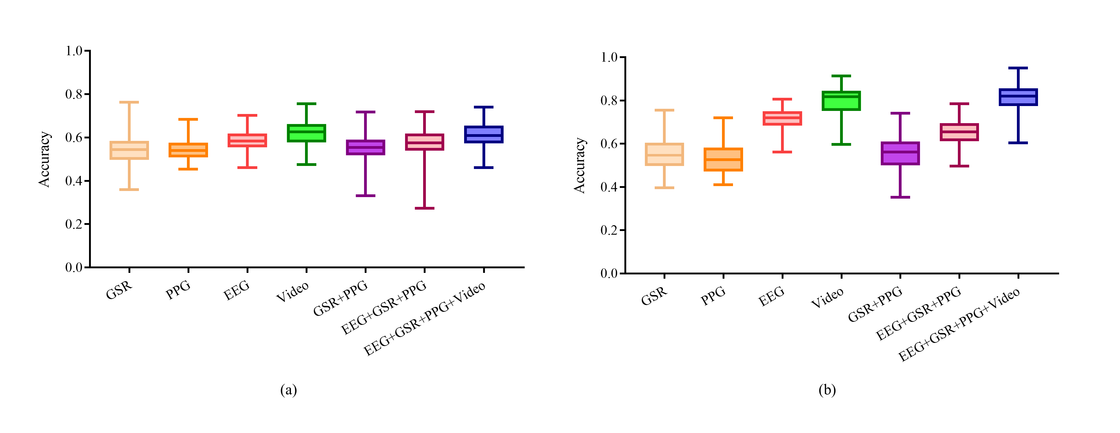 The experimental results are presented in Fig. 2. We tested seven feature combinations, including four single modality features (i.e., EEG, GSR, PPG, Video) and three multiple modalities features (i.e., GSR+PPG, GSR+PPG+EEG, GSR+PPG+EEG+ Video). Results in Fig. 2 show that SVM and all features (i.e., EEG+GSR+PPG+Video) obtained the best accuracy. Besides, EEG performs better than other physiological signals: it achieves not only higher classification accuracy but also a smaller standard deviation.