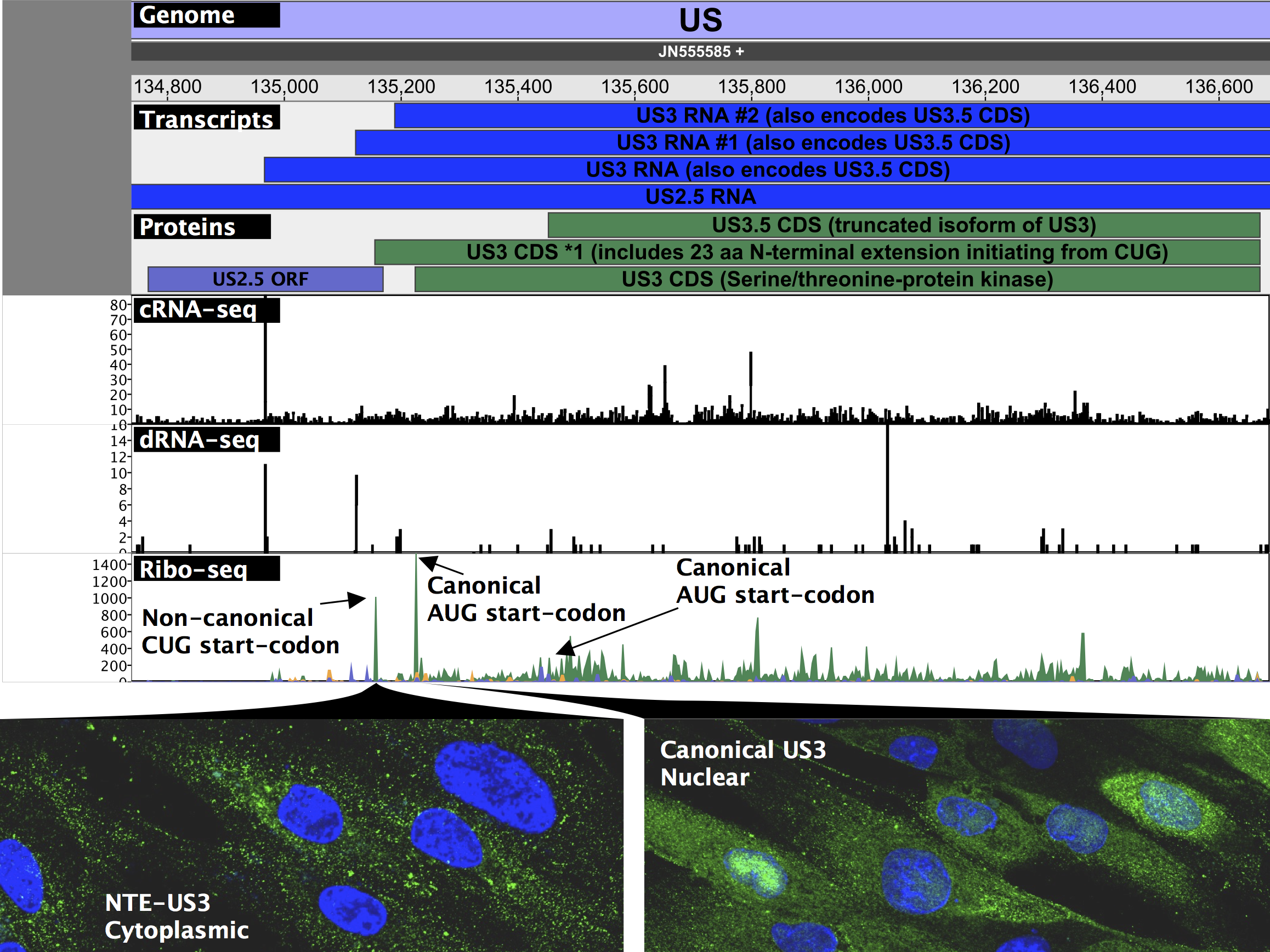 Before our work, it was widely accepted that HSV encodes roughly 80 proteins based upon a conservative definition of a coding sequence requiring at least 100 amino acids and beginning with an AUG start codon. By mapping the fragments of mRNA occupied by ribosomes (Ribo-seq), we identified over 200 additional open reading frames, many of which are much shorter than 100 amino acids and initiate with non-canonical start codons such as “CUG”. This flexibility in start codon usage, particularly late in infection when the cell’s physiology is most disrupted, enables temporally regulated expression of different protein isoforms. For two viral enzymes including the viral kinase Us3 in the figure below, isoforms initiating from upstream non-canonical start codons were found to have altered cellular localization during infection than their canonical, “AUG”-initiated counterparts and may thus serve different roles during infection.