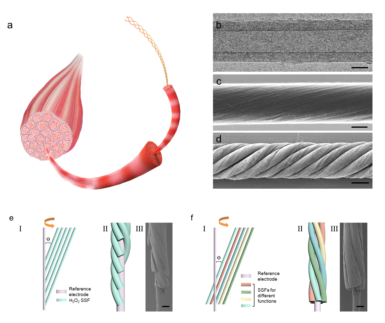 Fig.1: a, Schematic of the hierarchical structure of muscle. b, Representative transmission electron microscope image of a multi-walled CNT. Scale bar, 3 nm. c,d, Representative SEM images of a primary CNT fibre (c) and a hierarchically helical CNT fibre assembled from primary CNT fibres (d). Scale bars, 6 μm (c) and 20 μm (d). e, Schematic of the preparation process (i), schematic of the structure (ii) and a representative SEM image (iii) of an MSF with axial terminals and five evenly spaced SSFs for spatial analysis. Scale bar, 50 μm. f, Schematic of the preparation process (i), schematic of the structure (ii) and a representative SEM image (iii) of an MSF with radial terminals for multiplex monitoring, such as glucose, Ca2+, Na+, K+ and pH. Scale bar, 50 μm. The orange arrows in e and f indicate the twisting direction of the motor during preparation.
