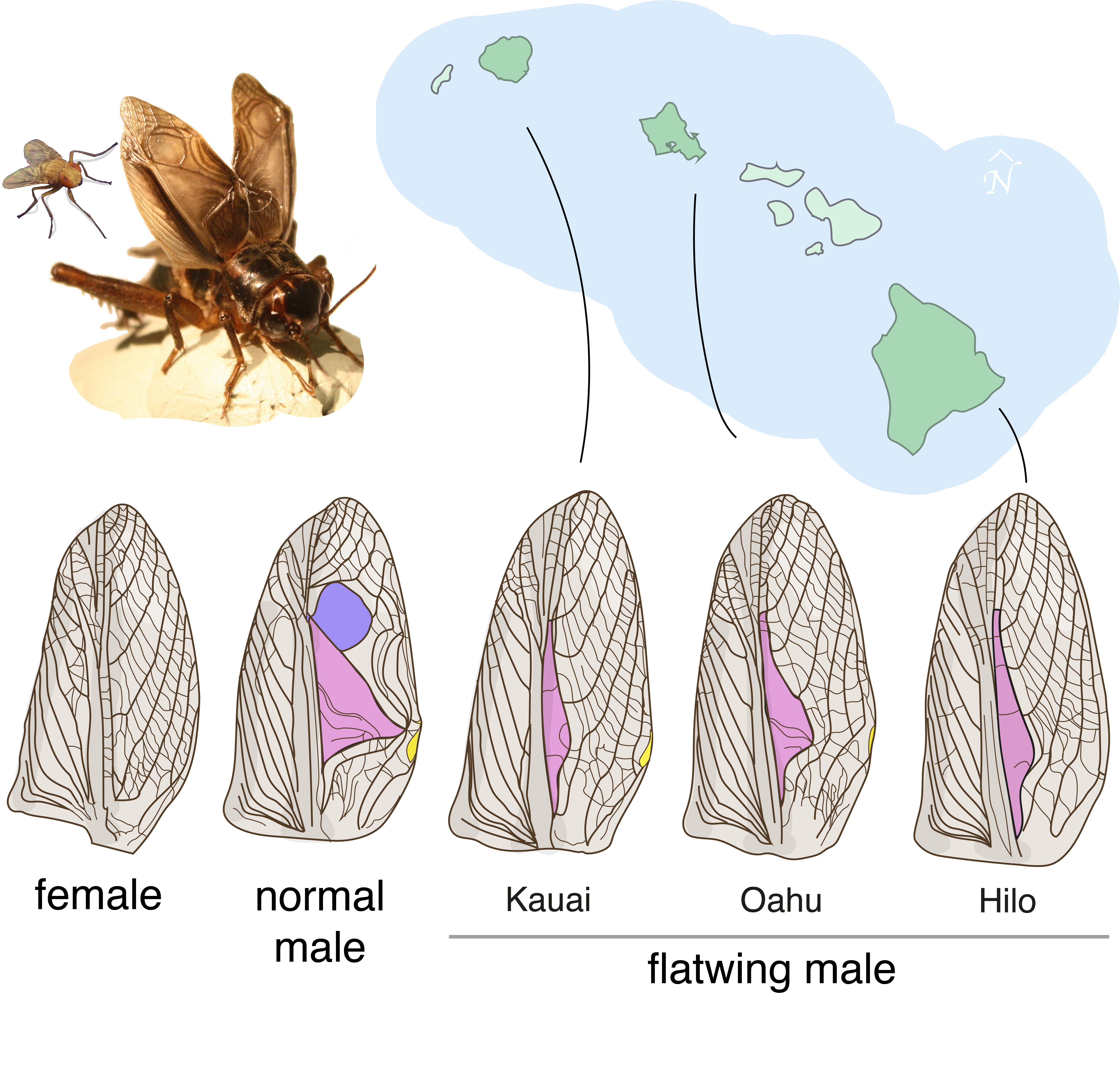 In our paper1, we combined genetic and morphometric approaches to examine the role that gene flow plays in a contemporary example of repeated adaptation: replicated loss of song in multiple island populations of Hawaiian crickets. Loss of cricket song is caused by a segregating X-linked mutation (or mutations) which causes morphological changes to the forewings male crickets ordinarily use to sing. This silent male phenotype, named ‘flatwing’, provides dramatic fitness benefits in Hawaiian cricket populations, where singing males are parasitised by larvae of an introduced, eavesdropping fly. An early study found over 30% of males able to sing were infested with deadly parasitic larvae, compared with less than 1% of silent flatwing males2. Testament to these fitness benefits, the spread of flatwing phenotypes has been observed on at least three, geographically isolated Hawaiian islands following the first identification in 20033.