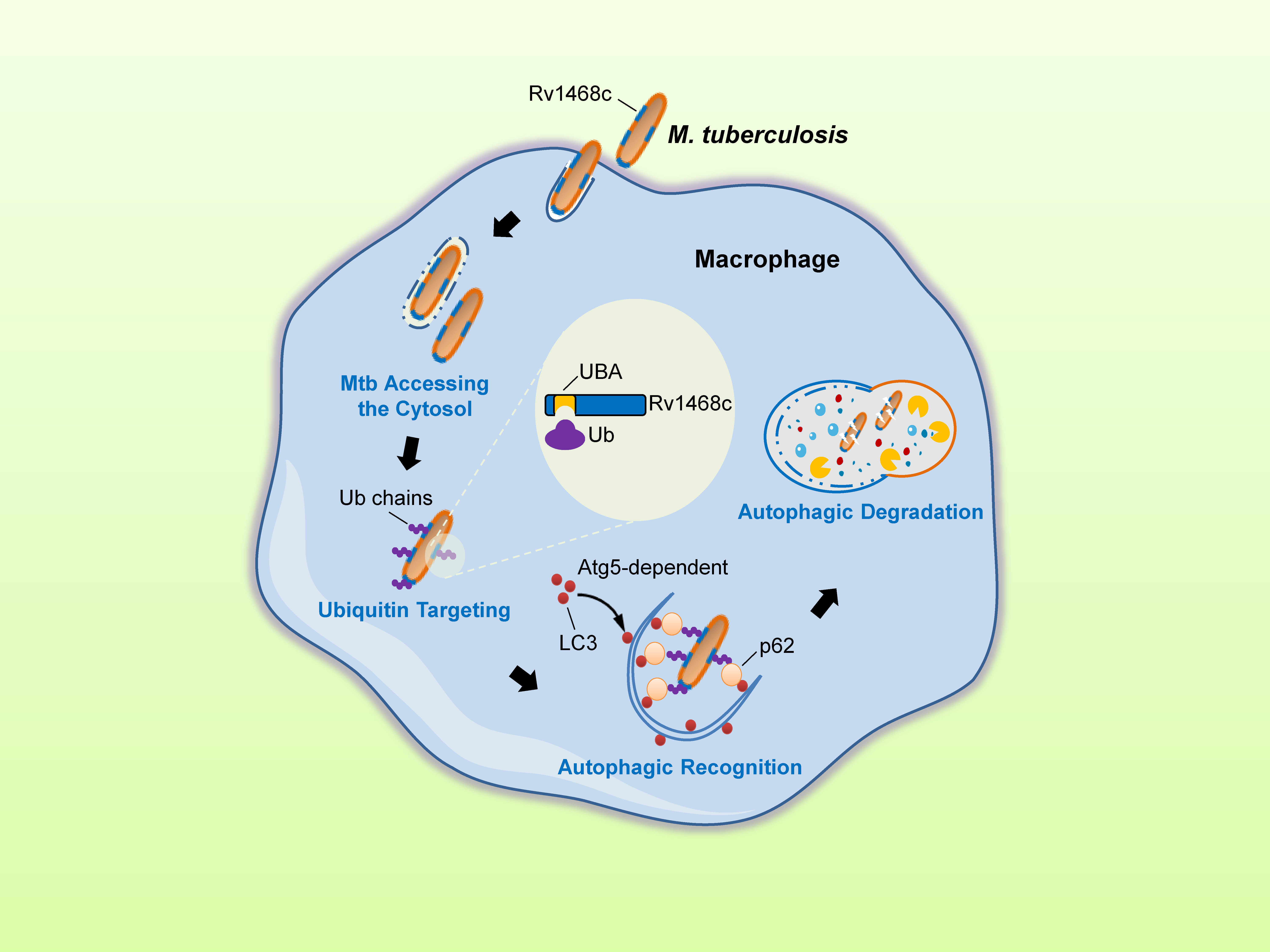 In our efforts to search for novel potential Ub-binding proteins (UBPs) that located on the surface of Mtb, we identified a eukaryotic-like Ub-associated (UBA) domain-containing protein Rv1468c (PE_PGRS29) that belongs to the mycobacteria-specific PE_PGRS family, proteins from which family are predominately expressed on the mycobacterial cell surface. We then confirmed that Rv1468c was expressed on mycobacterial surface. Then, interestingly, we found that ubiquitin chains could hydrophobically bind to the UBA domain of Rv1468c in vitro. In macrophages, the UBA-mediated direct binding of ubiquitin to Rv1468c could recruit autophagy receptor p62 to deliver mycobacteria into LC3-associated autophagosomes. Further investigations by using a mouse infection model demonstrated that disruption of Rv1468c-ubiquitin interaction increased bacterial loads in mice with elevated inflammatory responses.