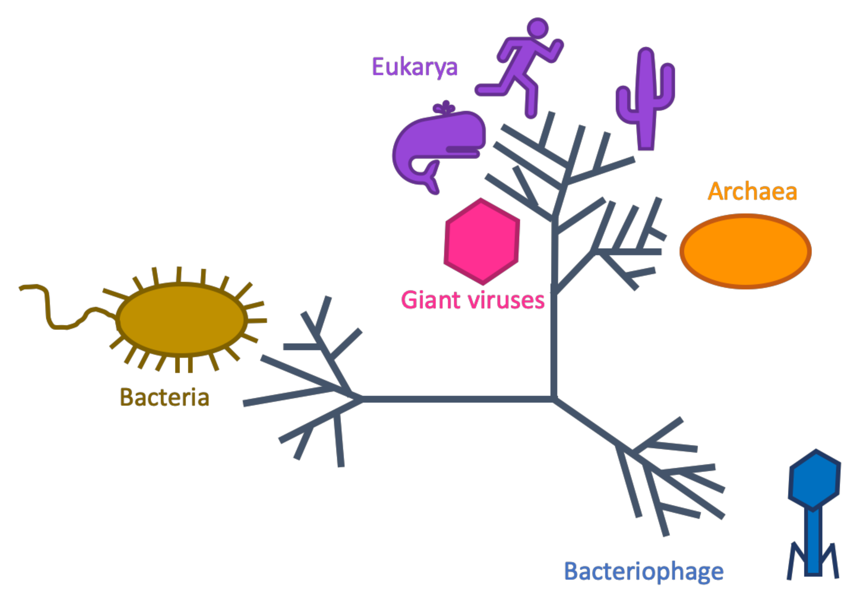 Therefore, we suspected these RNAP belonged to the clade of Nucleocytoplasmic Large DNA viruses (NCLDV), in which giant viruses belong. Giant viruses are… giant! They infect eukaryotes and have particle sizes and genome sizes that sometimes exceed those of cells. Many are known to encode their own multi-subunit RNAP. Surprisingly, when I included these giant virus RNAPs in our phylogeny, none of them grouped with that peculiar, ‘alien’ clade. Instead, they grouped near the Eukaryotes and Archaea.
