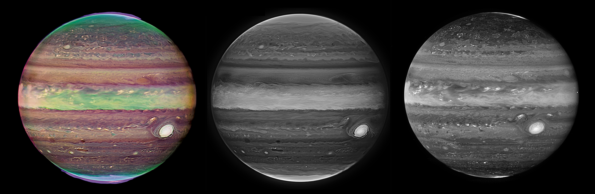 The JWST images of Jupiter opened new fresh views of the planet that were unlike any previous observation of the gas giant. Since Jupiter is a very bright target for JWST (which has a light collecting area that is 6.3 times larger than the Hubble Space Telescope), the images were acquired in wavelengths in which most of the light is absorbed in its path through the Jovian atmosphere by atmospheric gases such as methane and hydrogen. Thus, the selection of filters used in the observations included some of the wavelengths where the planet is the darkest; meaning that in many of these wavelengths Jupiter had never been observed at enough spatial resolution to resolve the weather systems in the atmosphere. Combining different filters that are sensitive to different amounts of atmospheric absorptions, the set of images obtained offers a three-dimensional view of Jupiter’s cloud systems that is remarkably sensitive to aerosols in the upper atmosphere near the tropopause, but deepening also in the troposphere and covering pressure levels from 1 bar to 100 mbar. Elevated clouds appear bright in these images, and the regular cloud systems observed in most ground-based and spacecraft images appear dark. In addition, the observations were designed to produce an instantaneous view of the atmospheric dynamics and motions of the Jovian atmosphere. This was done by acquiring two sets of images separated by a full Jovian rotation. The two sets of images can then be used to examine the relative motions of small-scale cloud systems tracking the winds with respect to Jupiter’s rotation.