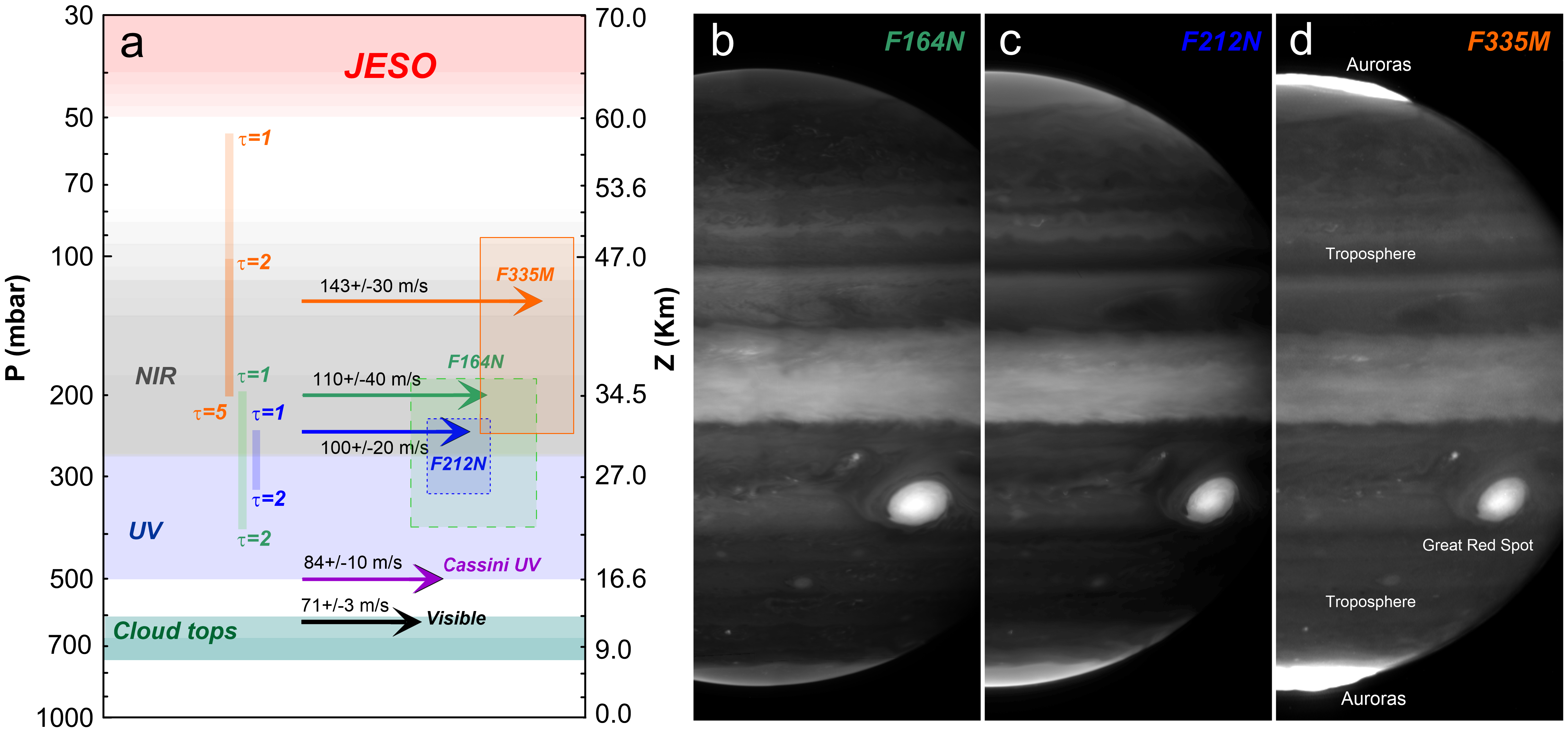Vertical structure of the central equatorial jet compared with images in which the winds were studied. The equatorial jet has weak winds of 70 ms-1 at the level of the cloud top (black arrow on the left panel), increasing in altitude up to values of 140 ms-1 about 20-40 km above the cloud tops (orange arrow on the left panel) resulting in a strong shear of the winds. The intense winds are located 20-30 km below Jupiter's Equatorial Stratospheric Oscillation (JESO). The JESO is a cyclic variability of Jupiter's equatorial temperatures that occurs on time-scales of multiple years and should also imply a cyclic pattern of variable winds. This makes the new Jupiter jet a likely deep counterpart of the JESO phenomenon.