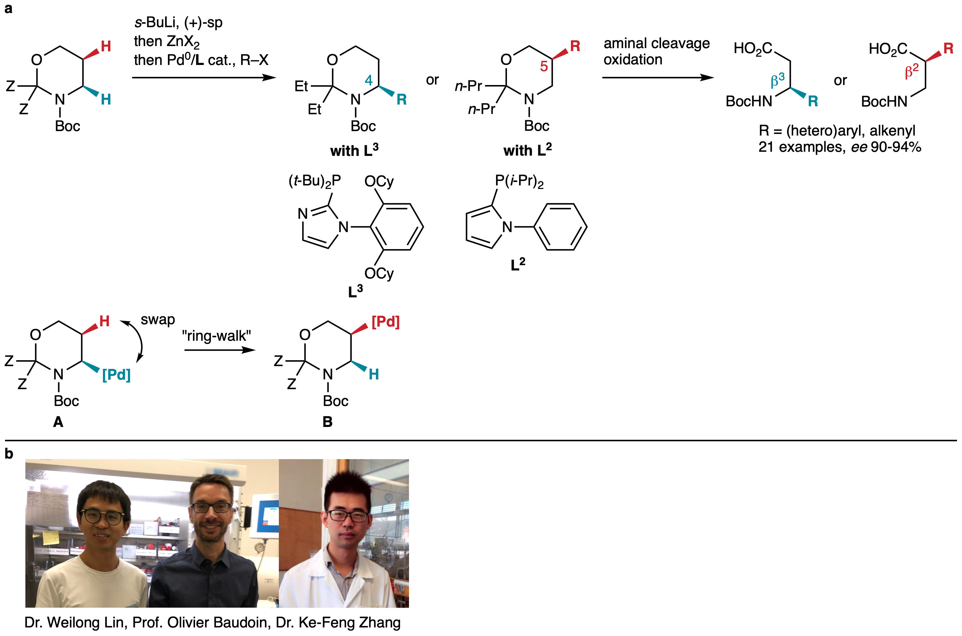 Investigations of other cyclic Boc-protected amines led Ke-Feng Zhang and Weilong Lin to discover that Boc-1,3-oxazinanes are lithiated with excellent yield and enantioselectivity using the s-BuLi/sparteine complex. Then, transmetallation to zinc and Negishi coupling in the presence of the bulky phosphine ligand L3, designed to inhibit Pd migration,[7] led to a perfectly C4-selective and highly enantioselective arylation (Fig. 2). Using the smaller ligand L2 already employed in the C3-selective arylation of Boc-piperidine completely switched the selectivity to the C5-position, leading to a range of C5-arylated and alkenylated products with equally good enantioselectivity. Such levels of selectivity were beyond our expectations and probably arise from the particular conformational features of the Boc-oxazinane substrates, which remain to be investigated. The analysis of the absolute configurations of various products confirmed that, after the enantioselective lithiation step, all subsequent steps occur with stereoretention. Mechanistically, the reaction proceeds through organopalladium intermediate A, which “ring-walks” stereospecifically to the next carbon (B) by swapping positions with a cis-located hydrogen atom.