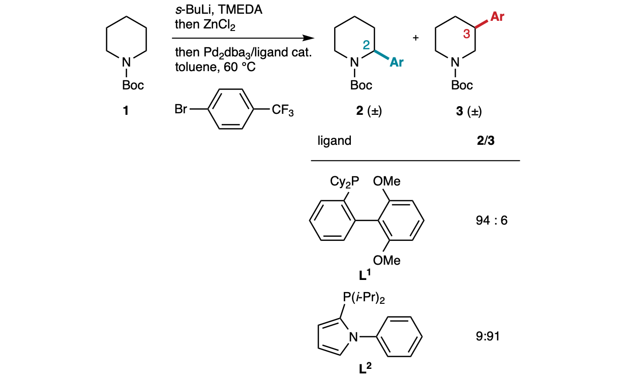 Fig. 1 Ligand-controlled arylation of Boc-piperidine at the C2 and C3-positions.