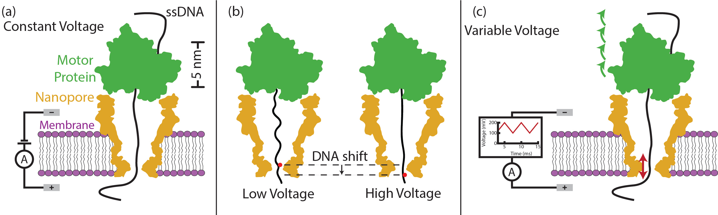Figure 1 (a) Regular nanopore sequencing applies a constant voltage across the membrane (purple), driving single-stranded DNA (black) through a nanometer-scale pore (gold). A motor enzyme (green) controls DNA motion through the pore. (b) Applying different voltages changes the force pulling on the DNA. Higher forces cause the DNA to extend further, shifting the DNA within the constriction of the pore and changing the bases sensed by the nanopore. (c) In variable voltage sequencing, we vary the voltage at 200 Hz, repositioning the DNA within the pore (red arrows) while the motor enzyme steps along the DNA at an average rate of ~20 Hz (green arrows).
