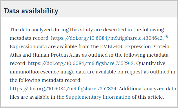 You can already find several published data and metadata records resulting from this pilot in the journal’s figshare repository, which also provides a place to publish supporting data files that have not been shared previously. An example Data availability statement is pictured, showing how authors have been able to go well beyond “data available on reasonable request”, with Research Data Support.