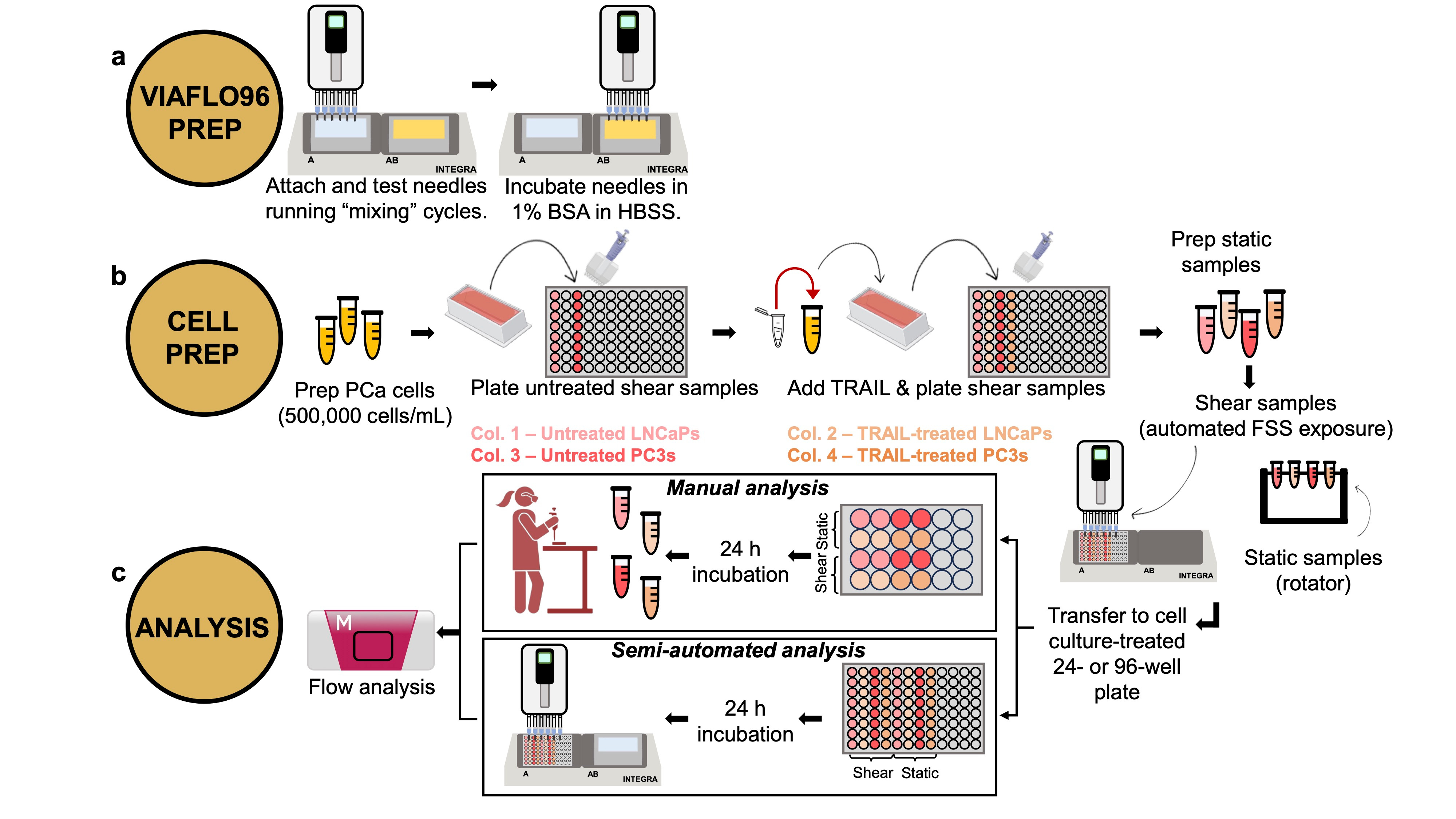 That brings us to our latest publication, in Communications Biology. In it, we present a new multiplex fluidic system for subjecting up to 96 samples at once (or 24, or 12, or 8, etc.) to pre-programmed shear stress signals that can exceed 10,000 shearing cycles, lasting several hours in total duration. Our system is based on a commercially available programmable multipipetter made by Allegra, called the VIAFLO96. The shearing process involves dipping the pipette tips into the sample wells, withdrawing the sample volumes into the pipette tips, then injecting the contents back into each well, what is termed a "shearing cycle". The Allegra system is compatible with three different pipette tip sizes, operates at 10 different flow rates, and many different patterns of shearing cycles can be programmed, enabling lab automation. We provide many useful "VIALINK" programs with our paper, along with some analysis programs implemented in Matlab. To achieve even higher shear stress magnitudes than can be produced using the standard pipette tips, we provide a protocol to equip the instrument with up to 96 syringe needle tips, in a form that can be autoclaved and reused many times. The choice of designing our approach around the (96) multiwell plate platform was to facilitate downstream analysis in plate readers, flow cytometers, etc., that can process multiwell plates. Detailed protocols and parts lists to adopt this approach are provided with the paper (see, for instance, Figure 1), as well as several different example data sets demonstrating mechanotransduction responses of cancer cells and primary murine dendritic cells.