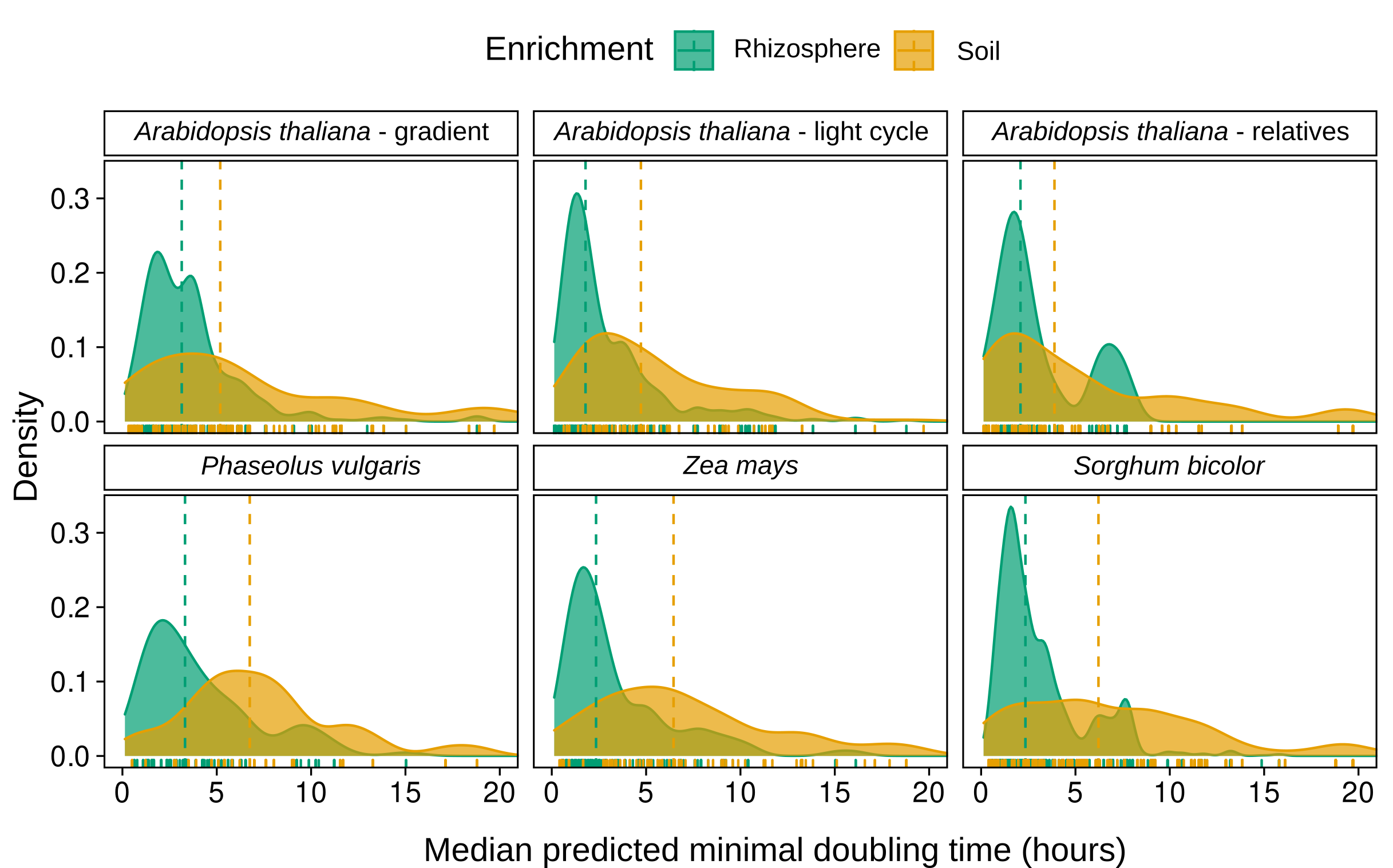We started our study comparing the growth rates of bacteria enriched in rhizospheres and their corresponding bulk soils, demonstrating that genera composed of fast-growing bacteria were indeed enriched in rhizospheres across a wide range of plant species, soil types, and environmental conditions (Figure 1).