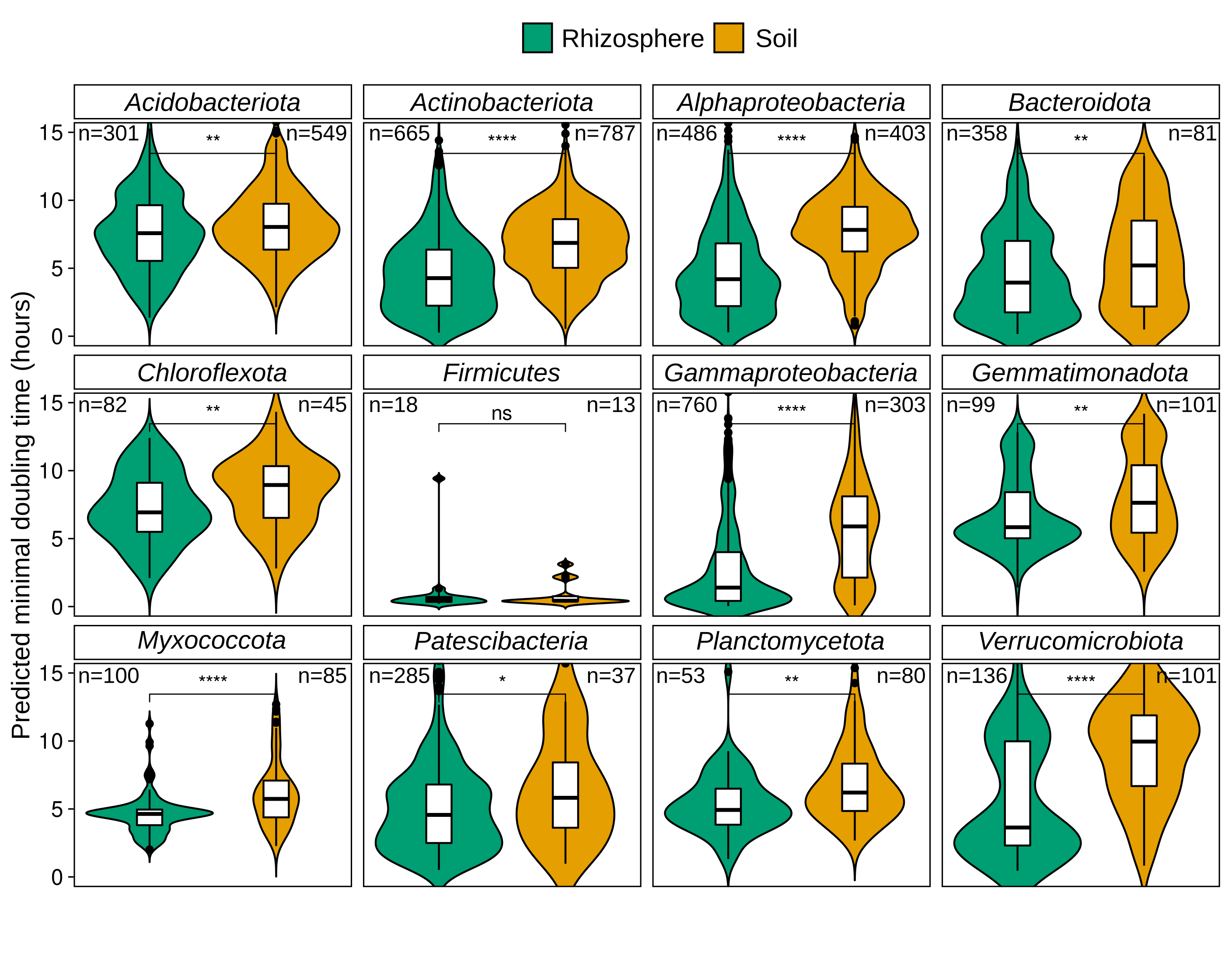 Figure 2: Predicted minimum doubling times in MAGs from rhizosphere and soil metagenomes. Distributions of predicted minimal doubling times in MAGs from rhizosphere and soils were compared with Mann-Whitney test (ns: p>0.05, *: p<=0.05, **: p<=0.01, ***: p<=0.001, ****: p<=0.0001).