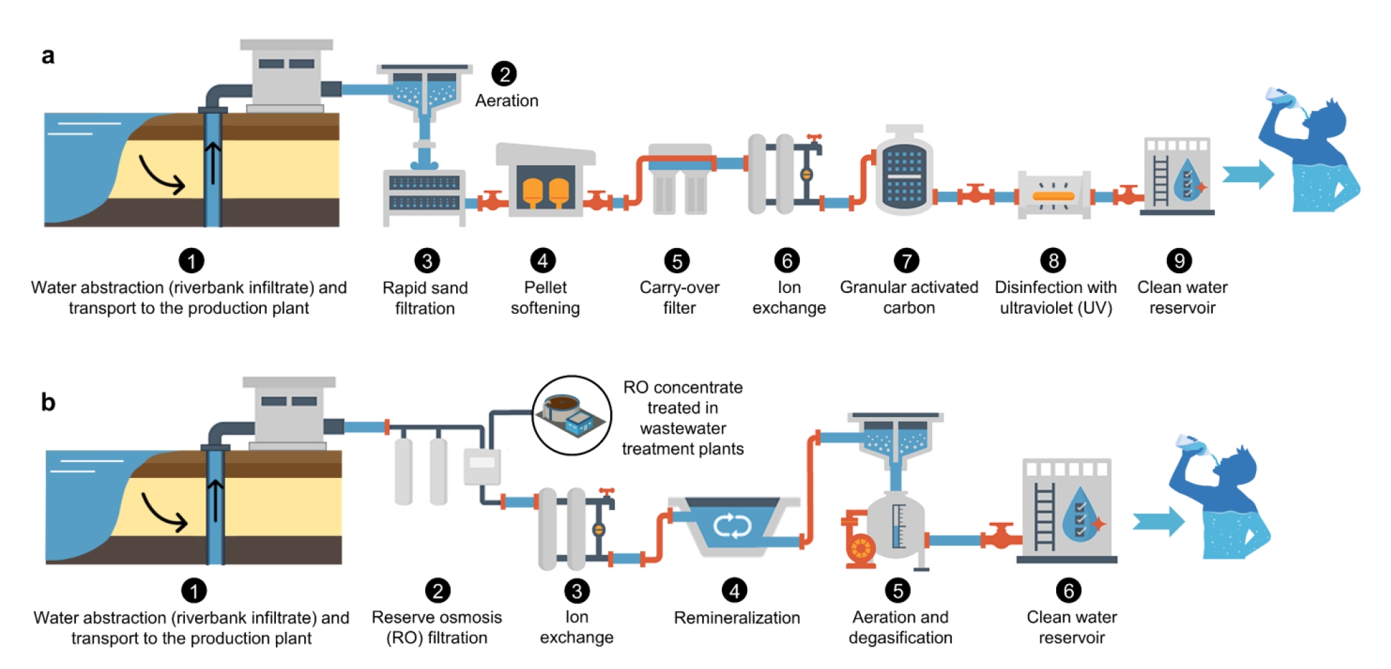 Process flow diagram illustrating the construction of alternative water production systems. a, riverbank filtration-extended treatment (RBF-ET) system. b, riverbank filtration-reserve osmosis (RBF-RO) system.
