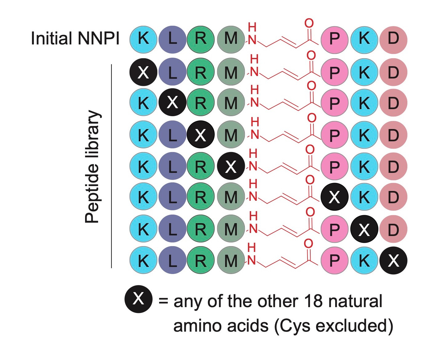 A screening approach to increase potency and specificity. At this stage, the cathepsin S inhibitor was not very potent, and had only partial specificity for the target. Thus, we needed to choose a strategy to improve its structure to make it more potent and at the same time specific for its protease target. Inspired by the site saturation mutagenesis approach used to study and engineer protein function, we designed a library of non-natural peptide inhibitors (NNPI) to test the impact of each possible amino acid change on the activity of the inhibitor. We tested the library on cathepsin S, and were very happy to observe many hits out of this first screening. We proceeded by validating the results and then combining the changes that we first identified, finally obtaining a very potent inhibitor of cathepsin S.