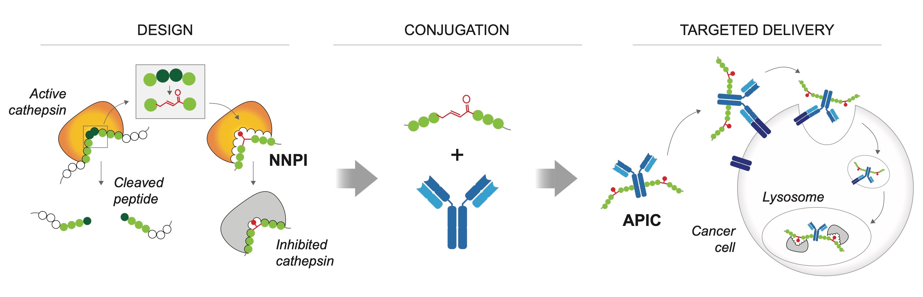 Antibody-conjugation to achieve specific cellular delivery. The NNPIs that we obtained are linear peptides that cannot cross biological membranes, therefore the last step of our drug development effort consisted in designing a delivery strategy that could overcome this problem and increase the half-life of NNPIs in vivo. Inspired by the success of antibody-drug conjugates in cancer treatment, we decided to use antibodies to deliver our inhibitors to cancer cells. Finding the right conditions for the chemical conjugation was hard at first, but our effort was more than compensated by the results obtained in cellular assays and in vivo! Treatment of cancer cells with antibody-peptide inhibitor conjugates (APIC) resulted in efficient internalization of our NNPIs, inhibition of the protease target in the lysosomes, and altered antigen presentation leading to a better immune recognition of lymphoma cells and subsequent cancer cell elimination by CD8+ T cells in vitro and in vivo (upon cathepsin S inhibition). Moreover, we showed that APIC-mediated cathepsin B inhibition in breast cancer cells hinders tumor invasiveness.
