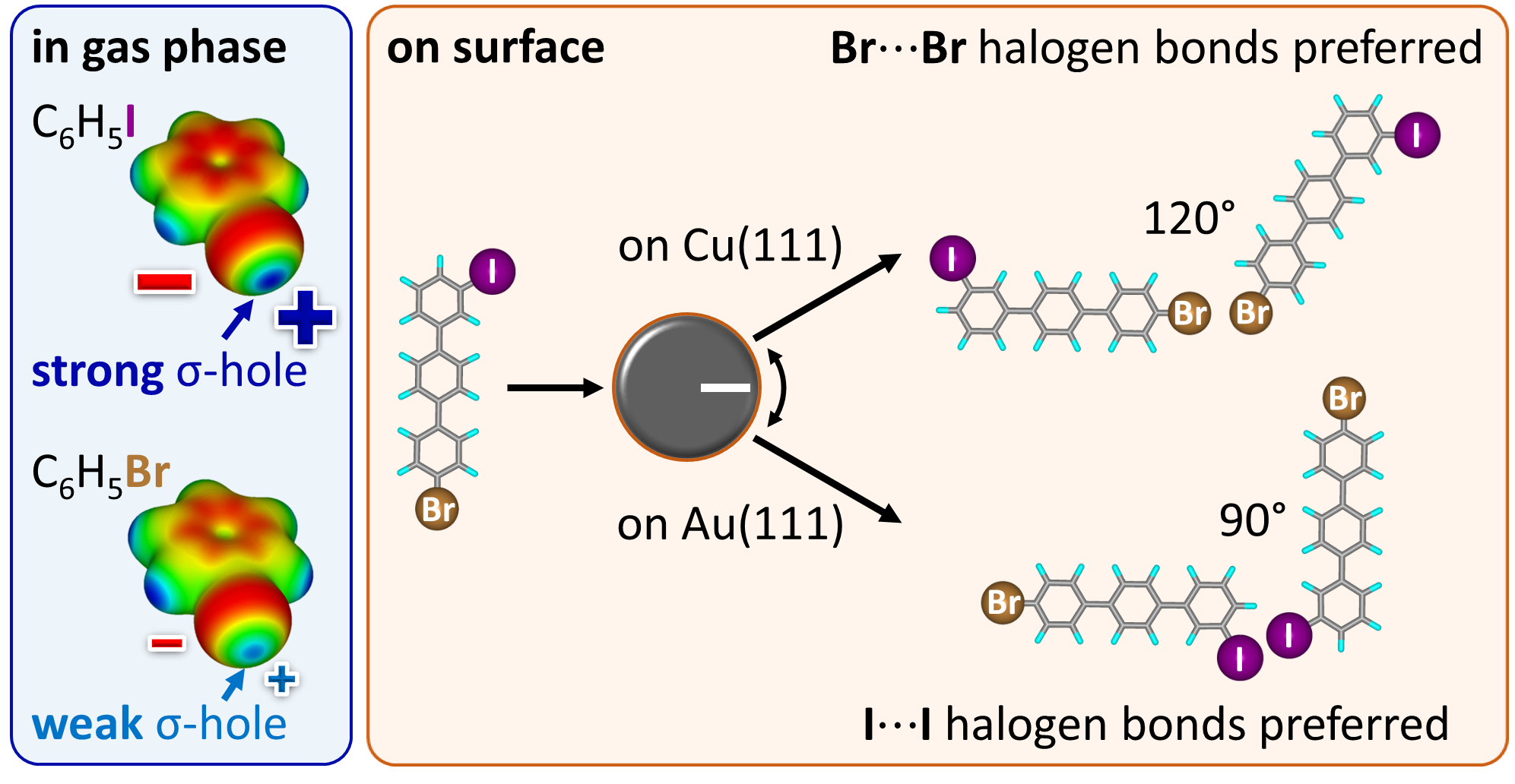 In our study we present an approach for tuning the strength and the directionality of intermolecular halogen bonds by adsorption of halogenated model compounds to reactive vs. inert metal surfaces. This approach relies on adjusting the charge distribution of the halogens by molecule-substrate interactions. In particular, it allows to tune the strength of the so-called σ-hole, a positive region at the caps of the halogens. Therewith, the anticipated binding selectivity can be either retained by adsorption on a relative inert Au(111) substrate or it can be even reversed by adsorption on a relative reactive Cu(111) substrate (see Figure 1).