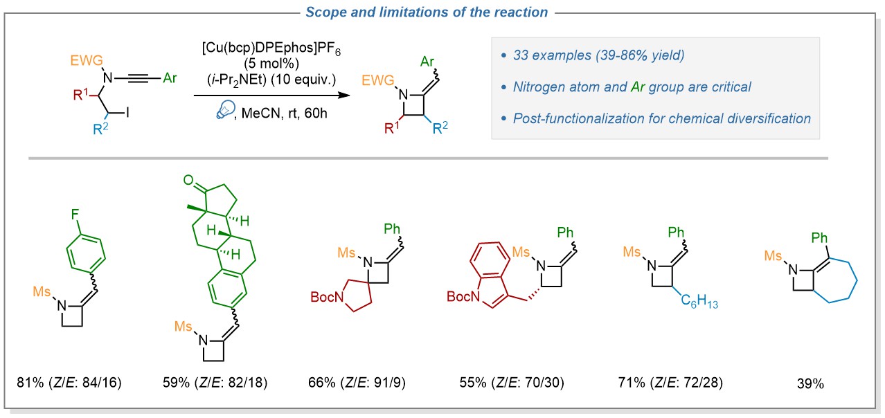 More details on this work can be found here: “A general synthesis of azetidines by copper-catalysed photoinduced anti-Baldwin radical cyclization of ynamides” in Nature communications (DOI: 10.1038/s41467-022-28098-x).