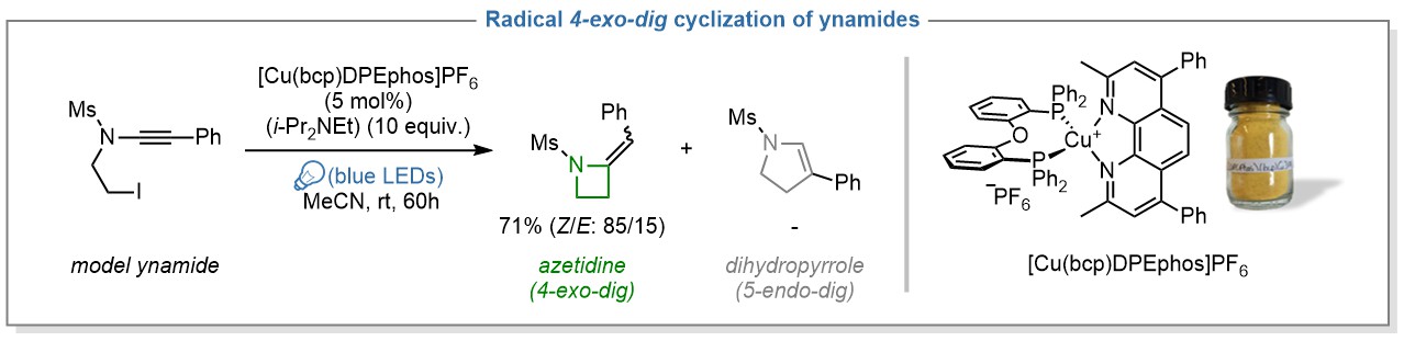 The chemistry of ynamides has been extensively studied in our group in the past years and we felt that the strong polarization of these nitrogen-substituted alkynes could be exploited to promote unusual radical cyclizations upon activation under photoredox conditions.5,6 The development of this reaction began with a standard optimization which quickly revealed that the combination of [Cu(bcp)DPEphos]PF6 as photocatalyst and Hünig’s base as sacrificial reductant under visible-light irradiation outperformed all other combinations we have tried, including those based on more common iridium photocatalysts. This system indeed allowed a clean conversion of our model ynamide substrate into the desired azetidine, resulting from a unique 4-exo-dig cyclization, without any traces of the dihydropyrrole that would have resulted from a more common 5-endo-dig pathway.