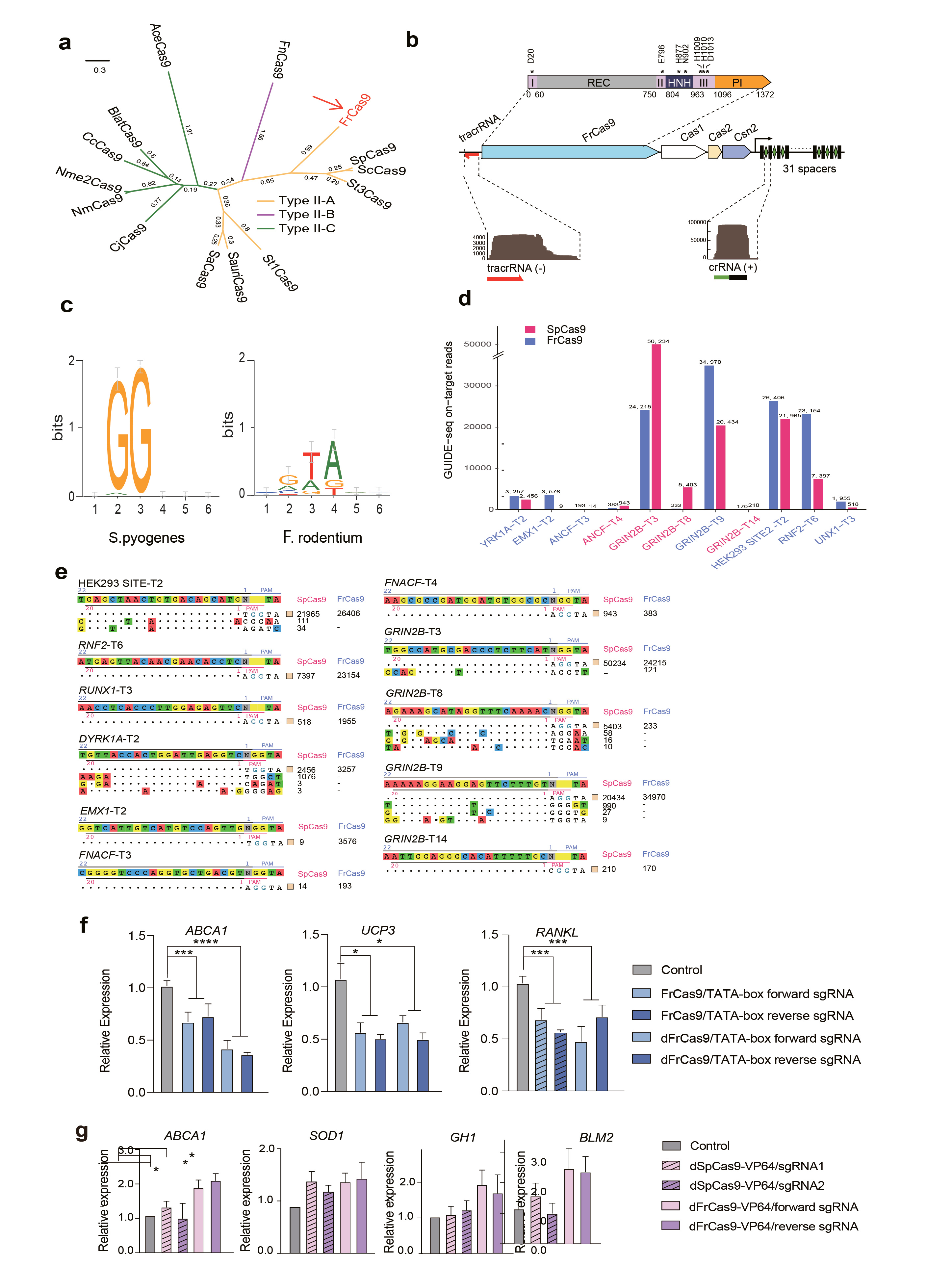 Fig. 1. (a) The phylogenetic tree of FrCas9 and 13 active Cas9 orthologs. (b) The schematic of Faecalibaculum rodentium systems. Insert above displayed the domains of FrCas9 with active residues indicated with asterisks. I, II, III represented three RuvC domains. Insert below showed expressed crRNA and tracrRNA from small RNA-seq of E.coli harboring pET-28A plasmid with simplified FrCas9 locus. (c) The schematic of depletion assay and web-logo results for SpCas9 and FrCas9. (d) Summary of GUIDE-seq on-target reads of SpCas9 and FrCas9 at the above 11 sites. (e) The off-targets of SpCas9 and FrCas9 for 11 sites, generated by GUIDE-seq in HEK293T cells. The sgRNA and PAM ranges of SpCas9 (20 nt sgRNA and 3 nt PAM) and FrCas9 (22 nt sgRNA and 4 nt PAM) were marked in rose and lavender, respectively. GUIDE-seq read counts of each site were shown on the right side. CRISPRi (f) and CRISPRa (g) of FrCas9 and SpCas9 by targeting TATA-boxes. The experiments were conducted in HEK293T cells and expression was quantified by qPCR. Error bars indicated S.D. (n = 3 per group, * P < 0.05, ** P < 0.01, *** P < 0.001, **** P < 0.001, Student's t-test).