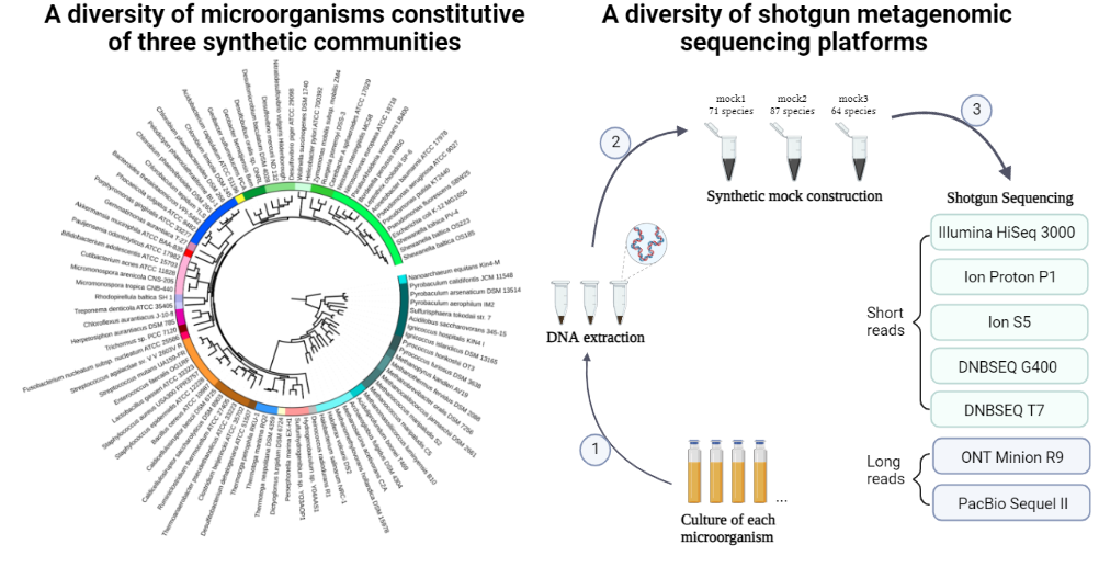 To assemble the synthetic communities, we used individually extracted DNAs from pure cultures of Archaea and Bacteria. Some strains and DNAs were obtained from various culture collections (DSMZ, ATCC), others from collaborators, others are isolates we obtained ourselves from various sources (human microbiome, various other environments). We grew many of the organisms in the lab (Oak Ridge National Laboratory), ranging from hyperthermophiles to aquatic, soil and human isolates and extracted the DNAs from those. It took time and effort, and for some it was linked to other culturomics projects. One of the most difficult part was to get the collection of DNAs spanning all the diversity we aimed for, including quantifying each and every DNA so that the relative abundance in the mock was as accurate as possible. Our synthetic communities ultimately included 91 species, some taxonomically closely related, spanning 29 archaeal and bacterial phyla.