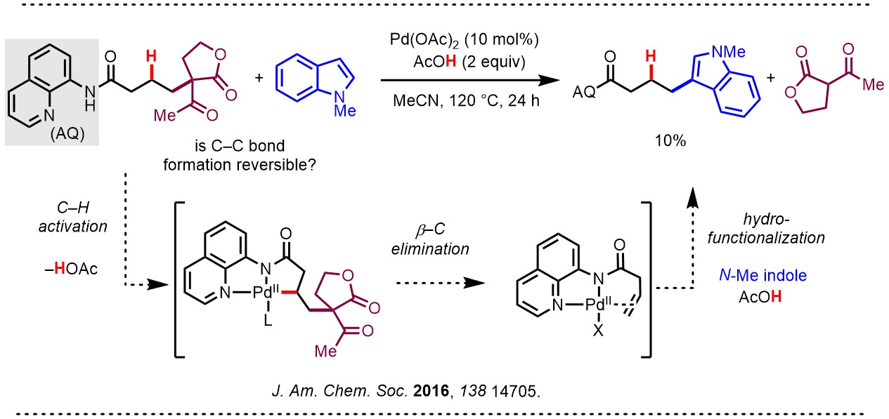 We became interested in metal-mediated strong bond activation through a non-obvious connection to our ongoing research on directed alkene functionalization. At the time, a postdoc in our lab, Dr. Kin S. Yang, was curious about a series of somewhat surprising results suggesting the reversibility of key steps in Pd(II)-catalyzed hydrofunctionalization reactions developed in our lab. In one experiment, for instance, an alkene substrate containing a pendant alcohol was subjected to standard Pd(II)-catalyzed hydrofunctionalization conditions. We predicted that the intramolecular alcohol would compete with the intermolecular nucleophile, giving rise to a mixture of products. Instead only the intermolecular nucleopalladation product was observed. To rationalize this observation, Kin proposed that the intramolecular attack does indeed occur faster than an intermolecular attack but that intramolecular attack is reversible. Thus, the transient metal-bound alkene can still be trapped by an intermolecular nucleophile