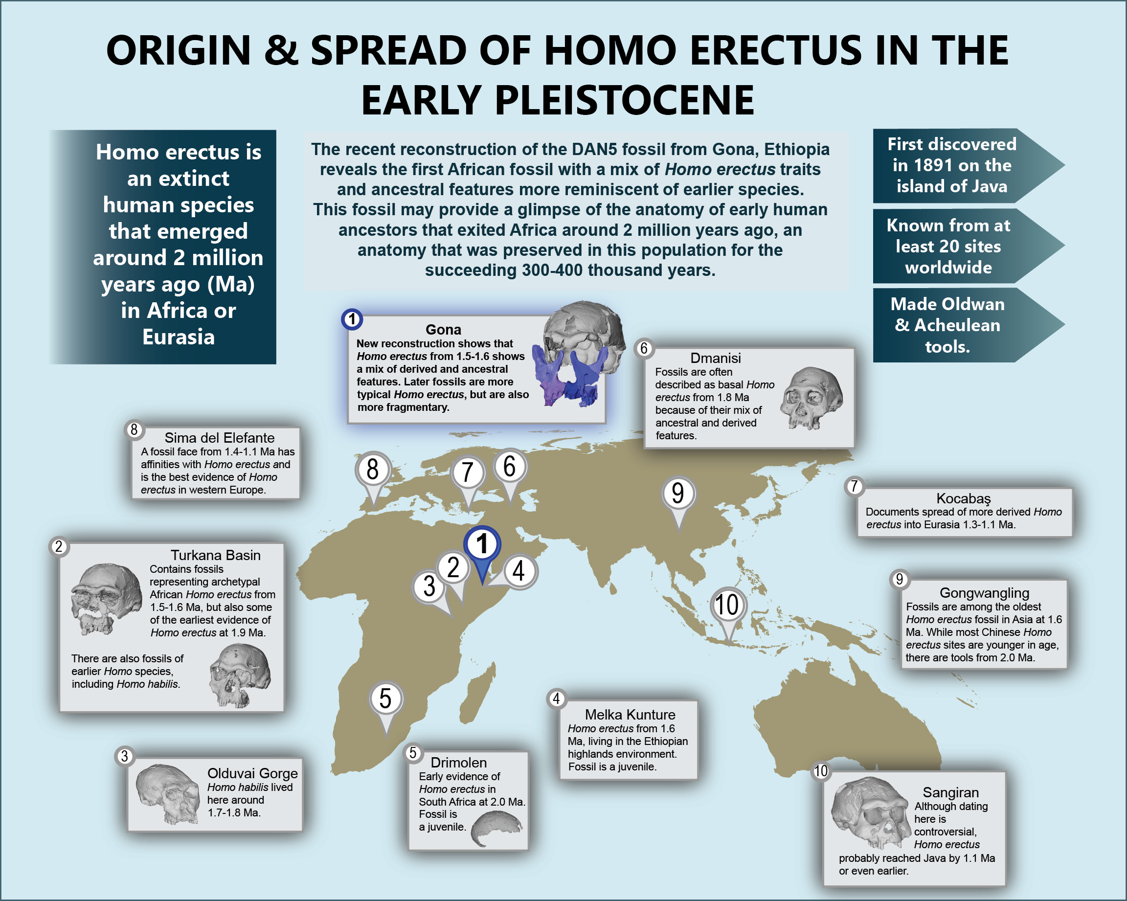 Traditionally, the origins of Homo erectus were thought to be eastern Africa based on both the oldest evidence of the species - a small fragment dated to 1.9 Ma - and the presence of a likely ancestor in the form of Homo habilis. Yet, the best evidence of fossils presenting a mix of ancestral (H. habilis-like) and derived (H. erectus-like) traits are from the 1.8 Ma site of Dmanisi, Georgia. This raised the possibility that H. erectus was not just the first human species to spread outside of Africa, but actually evolved outside of Africa. Our study in Nature Communications presents a virtual reconstruction of the 1.6-1.5 Ma DAN5/P1 fossil from Gona, Ethiopia that provides the first evidence of such intermediate morphology in Africa. The face and teeth are distinct from contemporaneous African Homo erectus fossils, and thus DAN5/P1 may provide a window into the anatomy of basal African Homo erectus.