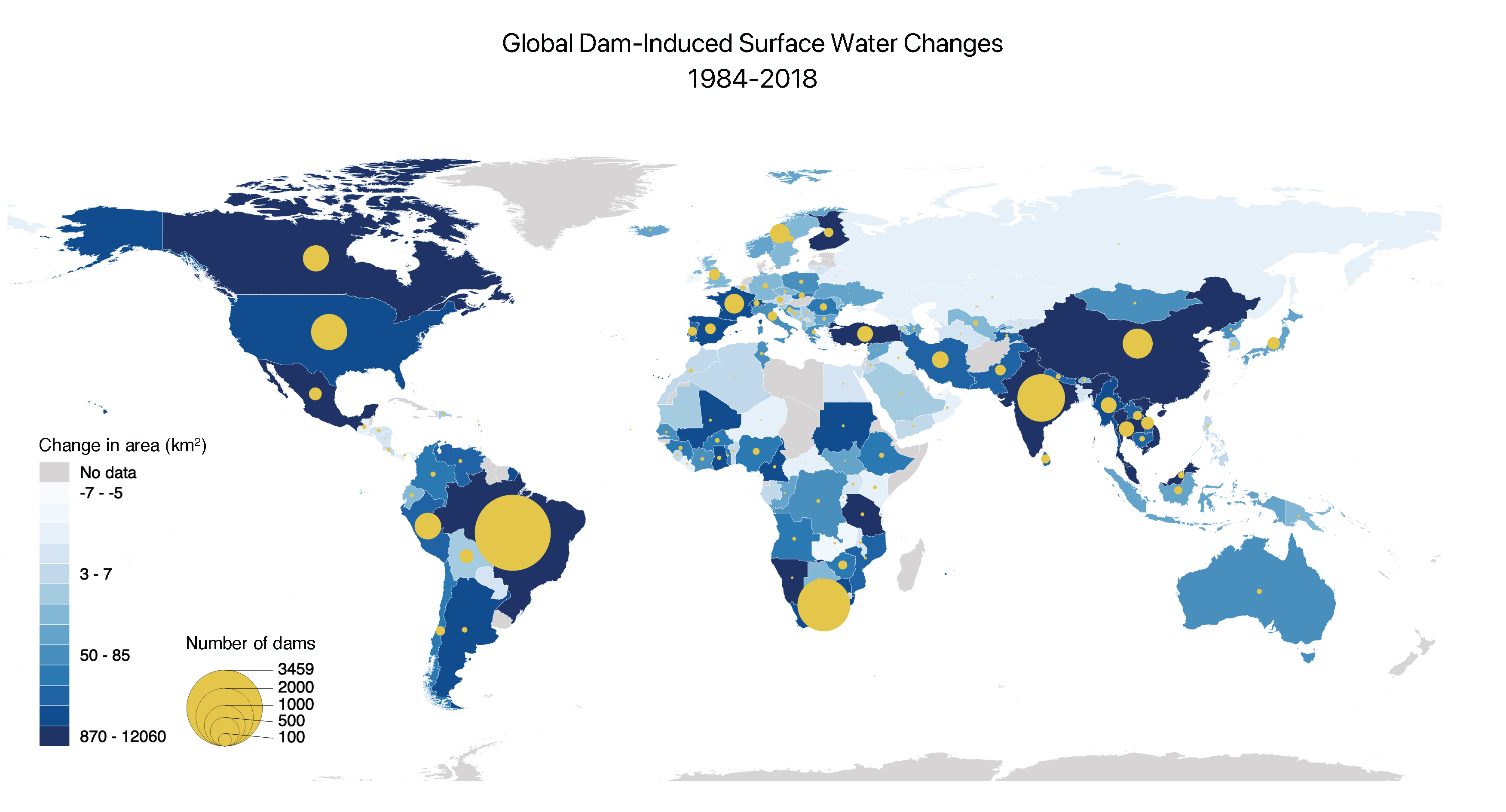 To allow for inter-temporal analysis of the impact of dam construction, we use an algorithm to derive the catchment areas corresponding to GDAT dams. Using various state-of-the-art satellite data products that span the past three decades, we calculate the changes in surface-water coverage induced by dam construction. Between 1984 and 2018, an area of more than 50,000 km2 has become seasonally or permanently covered with water due to the construction of dams. This area, larger than the size of the Netherlands, demonstrates that dams have substantially altered the location and persistence of surface water around the world.