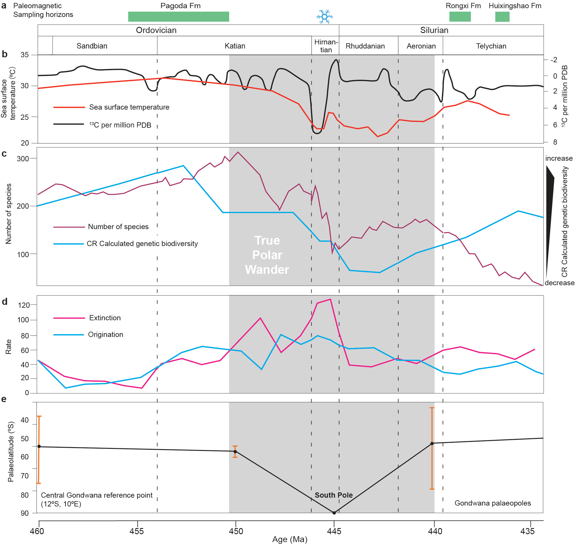a Temporal distribution of the palaeomagnetic sampling horizons by formation (Fm) from South China. Snowflake above the Hirnantian stage indicates the age of short, sharp glacial advance3. b d13C record (black) and atmospheric O2 concentration as a percentage of present atmospheric level (PAL; red) from Rasmussen et al.7. c Biodiversity during the Sanbian–Telychian stages from Deng et al.11 (purple line) and Rasmussen et al.7 (blue dashed line). CR: capture–recapture modeling. d Rates of origination (blue) and extinction (magenta) with 1 million year age binning from Deng et al.11. e Palaeolatitudinal variation of a reference point in central Gondwana (12ºS, 10ºE) calculated by using 460–430 Ma Gondwana palaeopoles listed in Supplementary Table 2. Note that the 430 Ma palaeopole is not displayed. Orange vertical bars are intervals of 95% confidence.