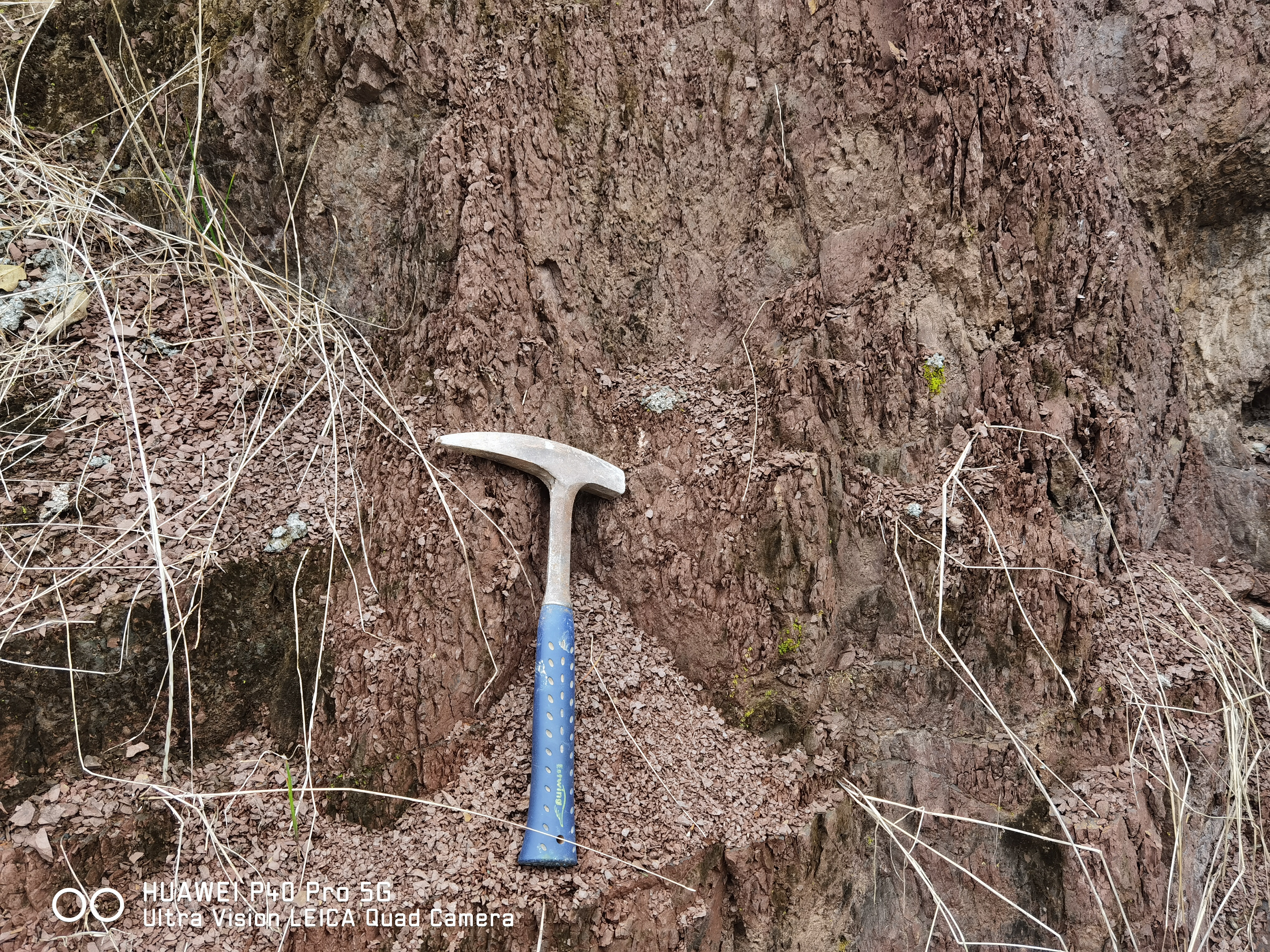 We discover a new field section for palaeomagnetic research in south China's montane zone. We carried on our work in December, which unfortunately was very cold and wet. What is worse is that the rock is crushed (Fig. 2). We dug the crushed rock all morning every day in the cold winter with no sun but drizzle (Fig. 3).