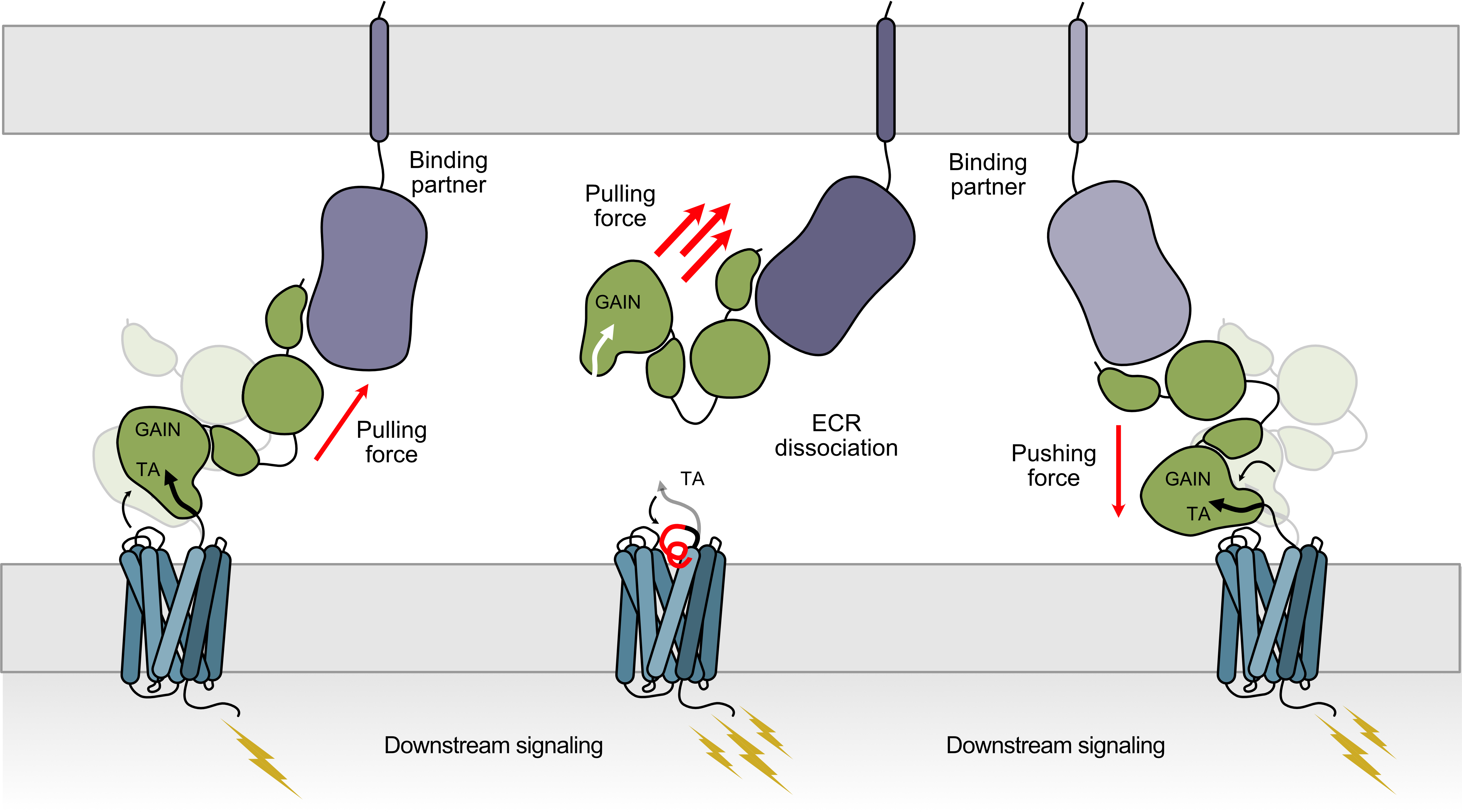 These features suggest that the ECR-mediated mechanism operates alongside TA-mediated activation, providing a versatile toolkit for aGPCRs to adapt to varied biological contexts (Fig. 4). The ECR-mediated activation mechanism has broad implications for the field of GPCR biology. aGPCRs represent a largely untapped class of therapeutic targets, despite their involvement in numerous diseases, including cancer, neurodevelopmental disorders, and immune dysfunction. The correlation between receptor conformation and specific signaling pathways hints at potential for signaling bias, where certain ligands or forces preferentially activate one pathway over another. Understanding aGPCRs dual activation mechanisms could help with the design of drugs that selectively modulate receptor activity, adapting therapeutic strategies to specific signaling pathways.