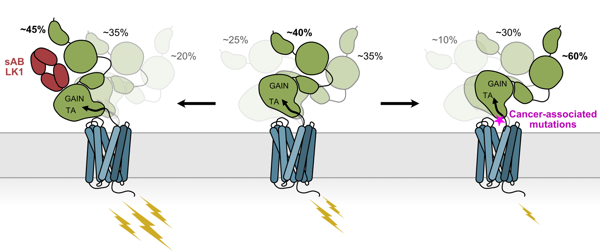 Agonistic antibodies shifted the receptor’s conformational equilibrium, promoting states potentially associated with increased signaling (Fig. 3 – left). Conversely, cancer-associated mutations at the GAIN-7TM interface altered the conformational distribution in the opposite direction, leading to reduced receptor activity (Fig. 3 – right).