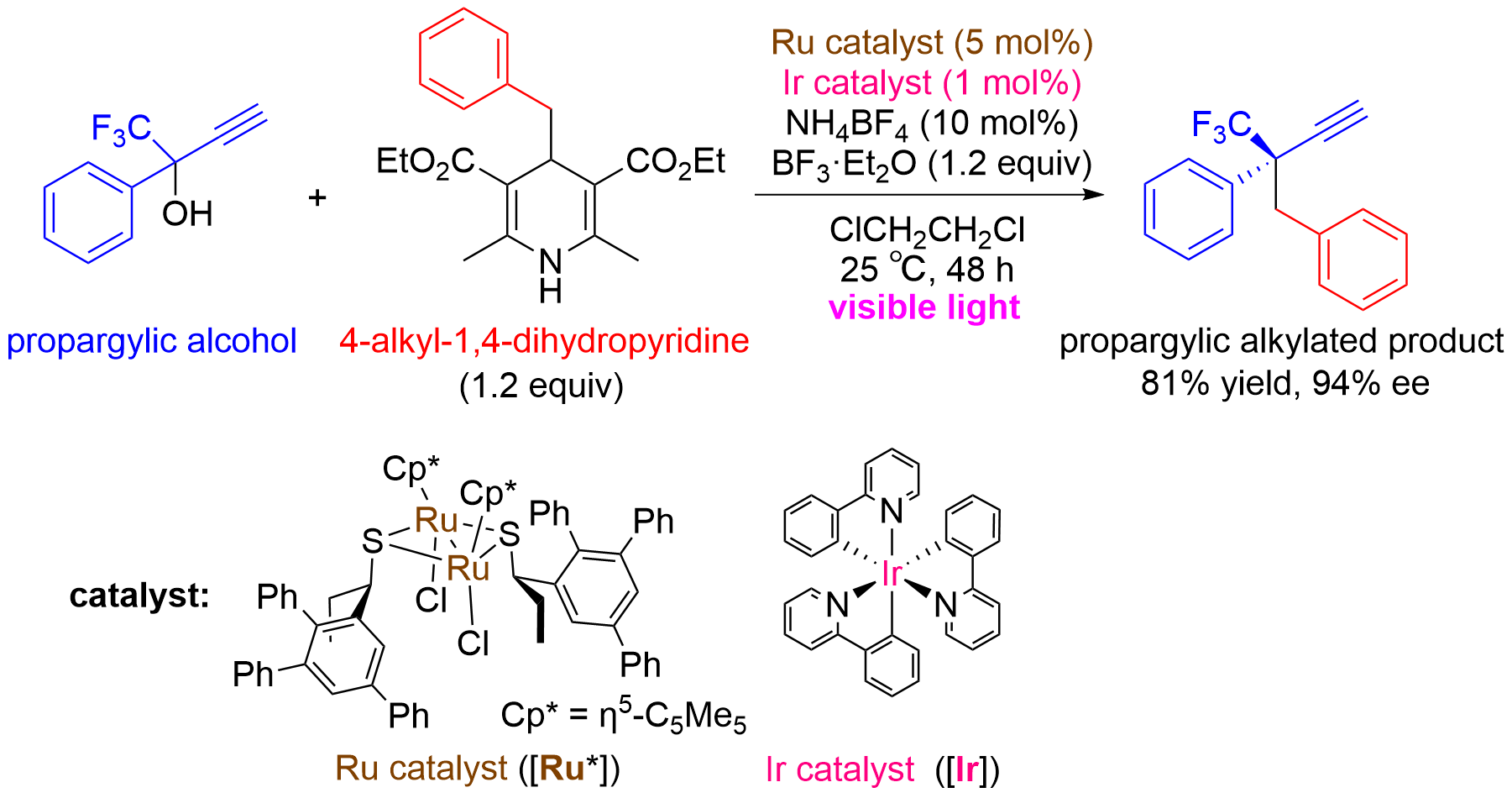 Both experimental results and DFT calculations support that a plausible catalytic reaction pathway can be drawn as consisting of two catalytic reaction cycles: the iridium-based photoredox catalytic cycle and the ruthenium catalytic cycle. Here, the iridium catalyst is excited under visible light irradiation, followed by a single-electron transfer between 4-alkyl-1,4-dihydropyridine and the photoexcited iridium species to afford an alkyl radical and an anionic iridium species. Then, the alkyl radical attacks at the γ-position of the ruthenium allenylidene complex, obtained by the coordination and dehydration of the propargylic alcohol upon the ruthenium catalysts, to afford the alkynyl radical complex, which is further reduced by the anionic iridium complex through single-electron transfer to afford the alkynyl complex, where the propargylic alkylated product is liberated by further protonation and ligand exchange with another propargylic alcohol. Here, the diruthenum core of the ruthenium catalyst acts as an electronic pool to stabilize reactive intermediates including radical species, furnishing the propargylic substitution reactions with free alkyl radicals. The result described in this paper provides the successful example of transition metal-catalyzed enantioselective propargylic substitution reactions with free alkyl radicals.