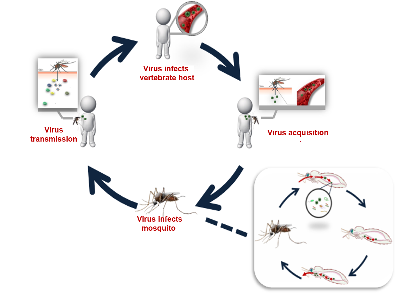 The classic transmission cycle of ZIKV is established between a vertebrate host and an invertebrate vector. Mosquitoes acquire the virus via biting an infected patient and then transmit ZIKV to a healthy person when the infectious viral particles are released into the saliva of the mosquitoes (Fig. 1).