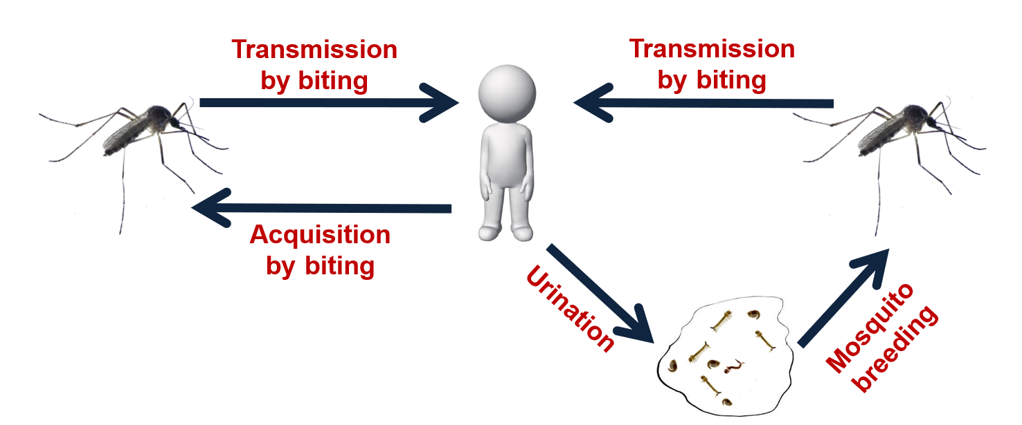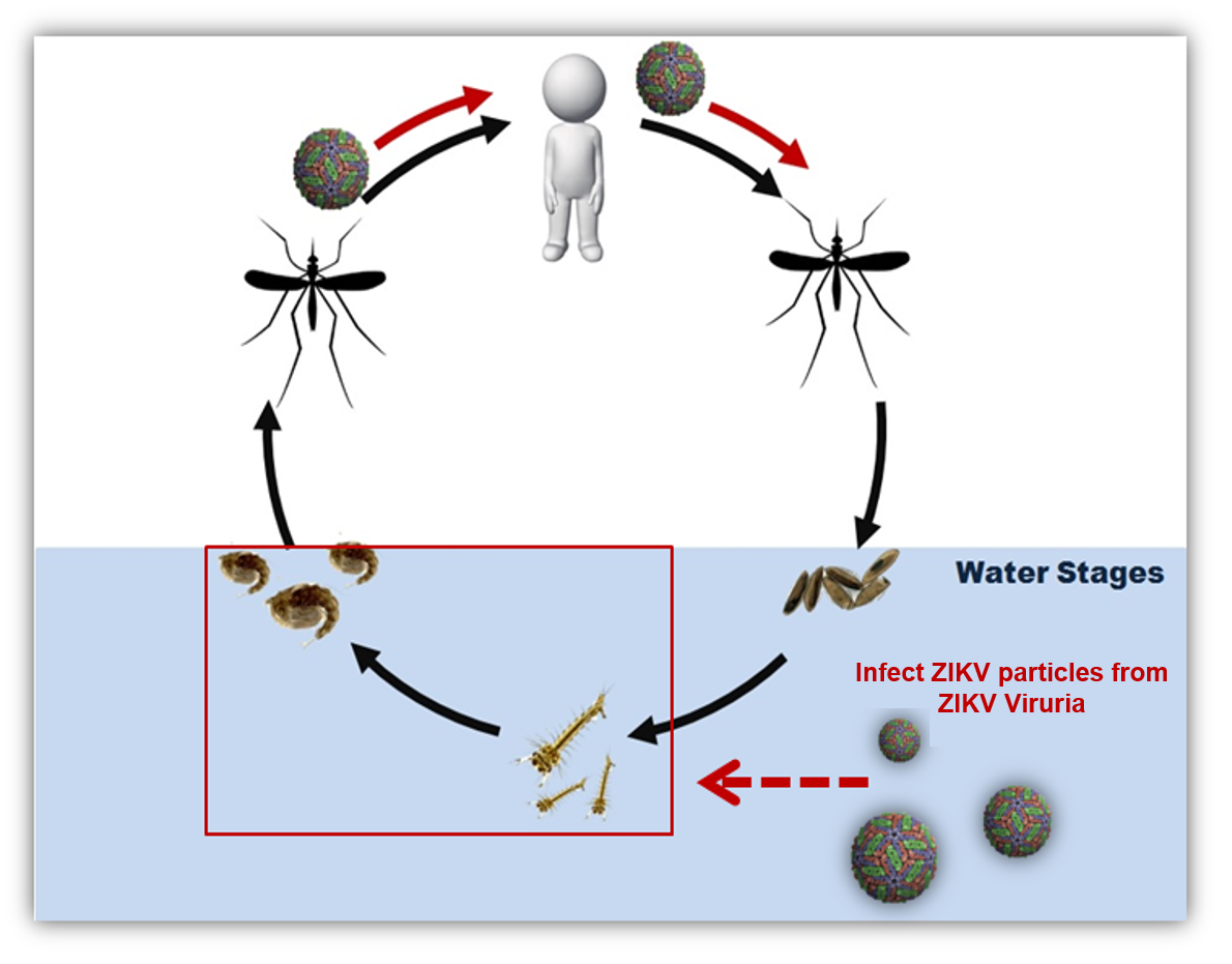 First, we noticed that ZIKV genomic RNA can exist in infected human urine for up to several weeks. In addition, several independent studies claimed that infectious ZIKV particles were detected and isolated from patients’ urine samples. The life span of the mosquito includes an immature aquatic larval stage and a pupal period before they emerge as an adult mosquito. Hence, we can image a scenario in the ZIKV outbreak region. Many infected individuals may intensively discharge a large volume of infectious urine into a restricted aquatic habitat with immature mosquitoes,and the mosquito larva and pupa may directly contact the viral particles and become infected (Fig. 2).